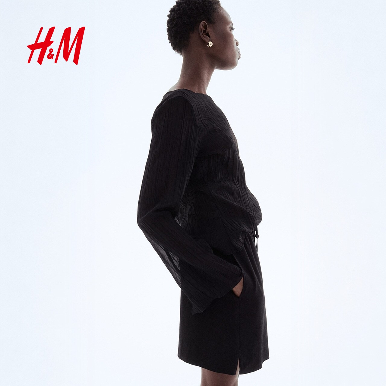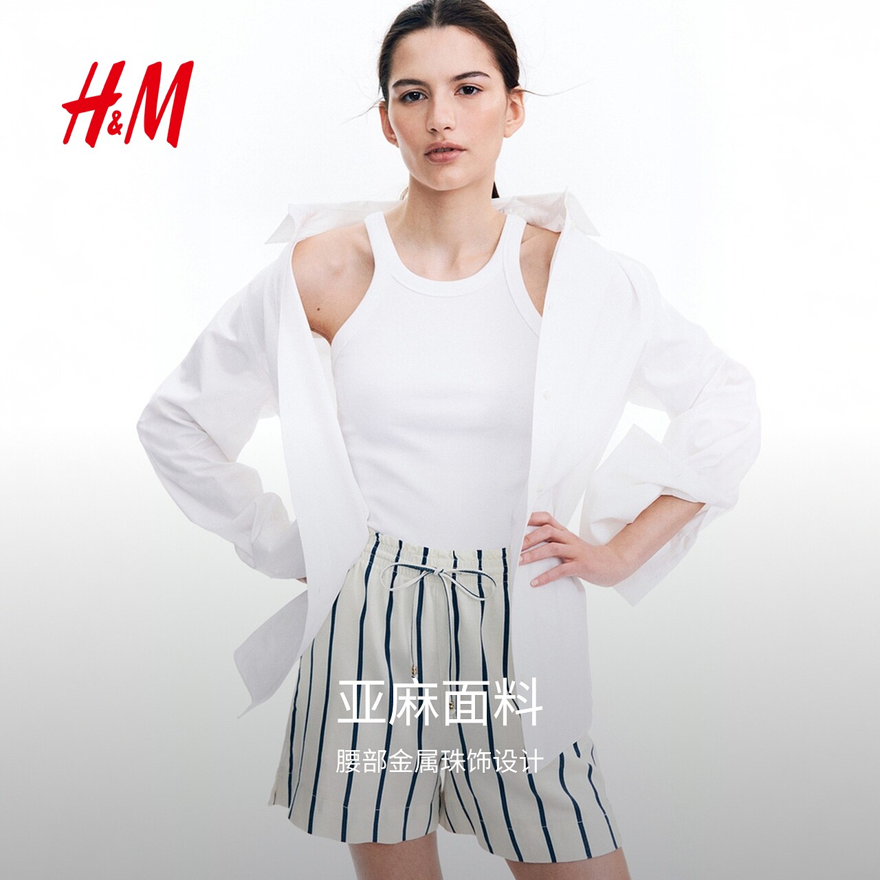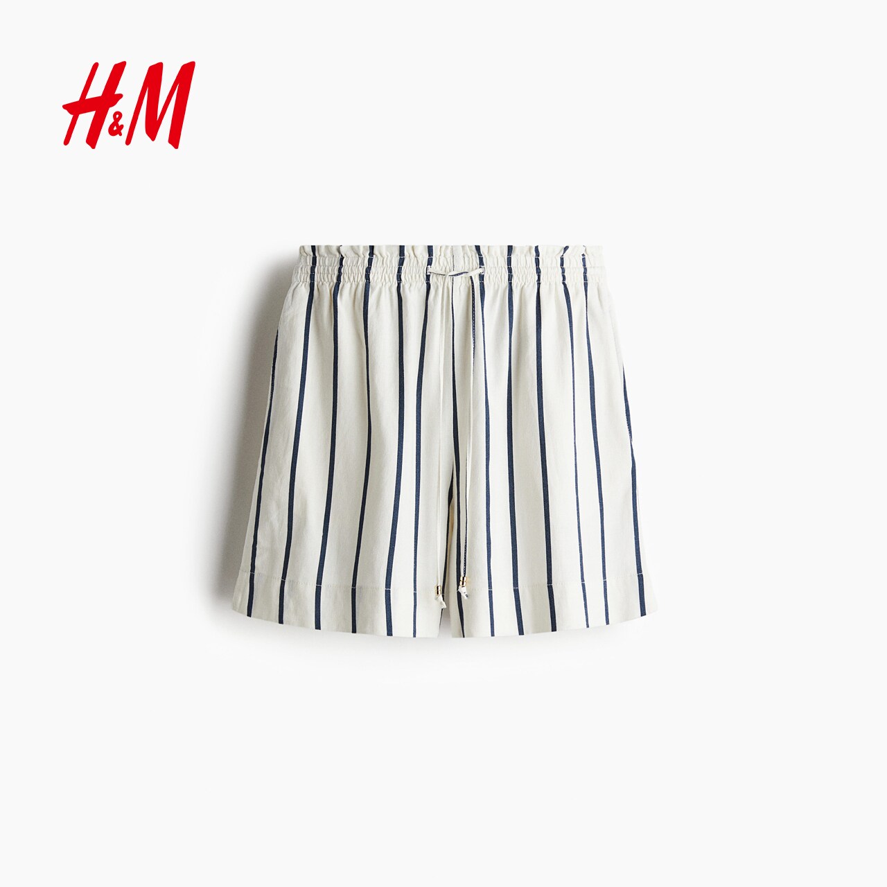 HM女装休闲裤春季亚麻混纺通勤舒适休闲抽绳短裤1259218