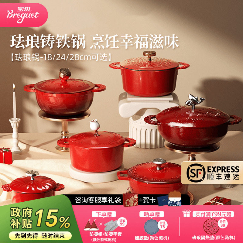 Breguet宝玑红色珐琅锅家用新婚乔迁礼物铸铁锅焖炖汤锅燃气煮锅