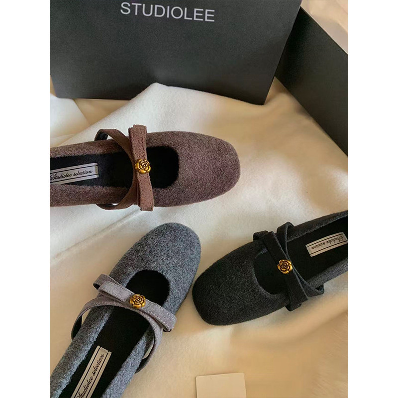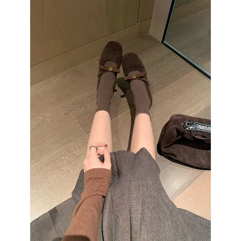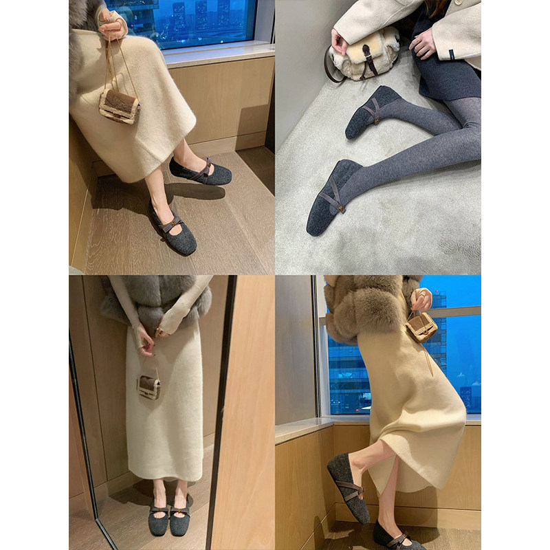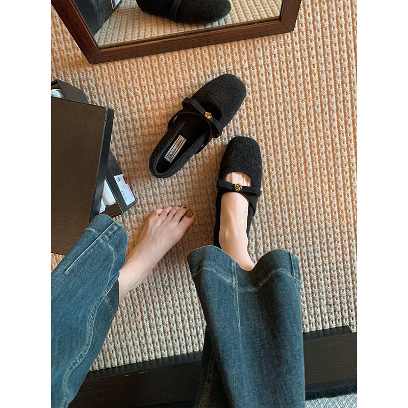 羊皮版复古玛丽珍鞋女方头秋冬季加绒保暖毛毛棉鞋平底晚晚单鞋女