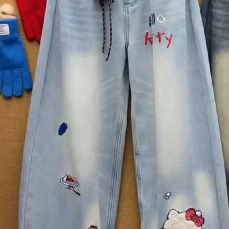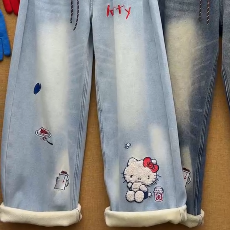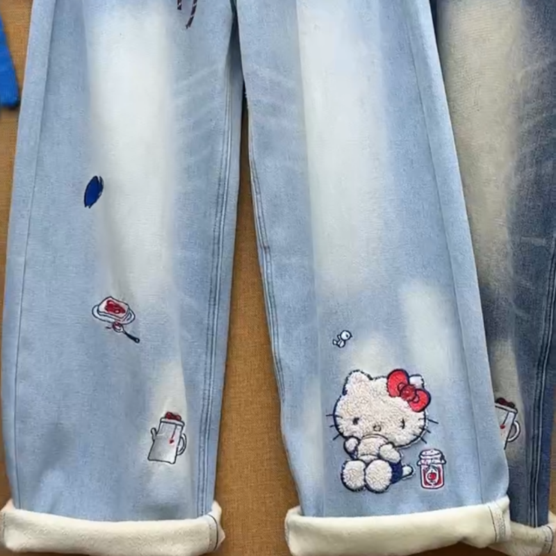 美式立体刺绣卡通Kitty猫设计牛仔裤女2025年冬季新款加绒阔腿裤