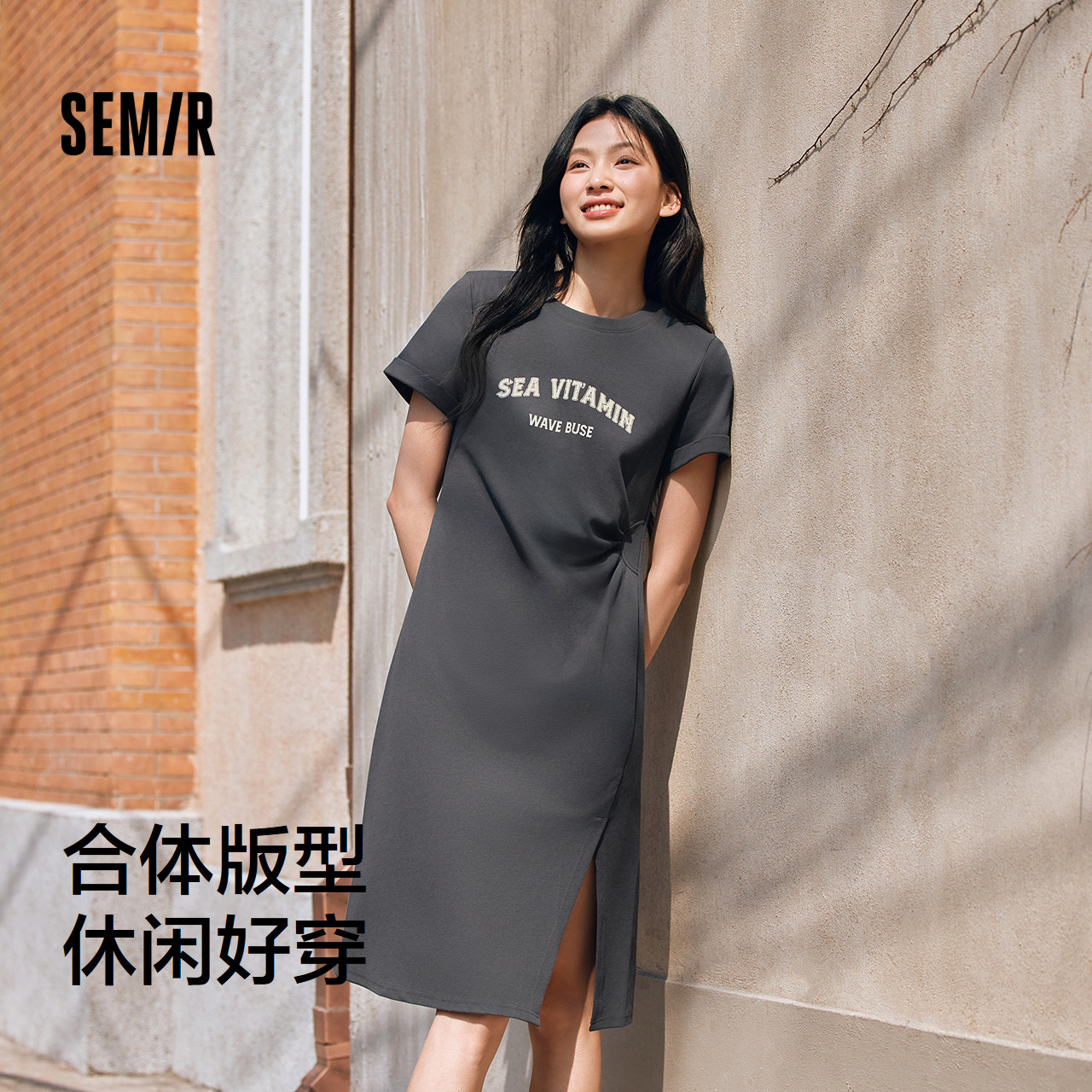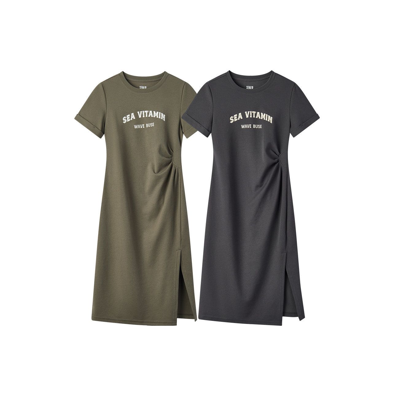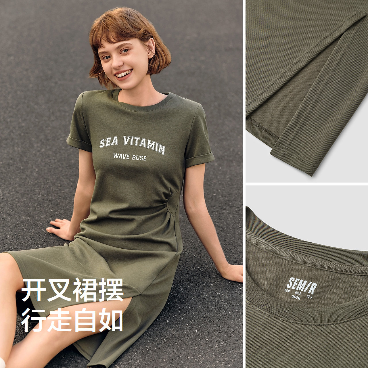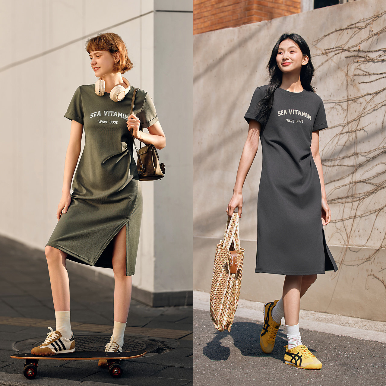 森马连衣裙女复古休闲中长裙简约风夏季小心机字母开叉T恤裙显瘦