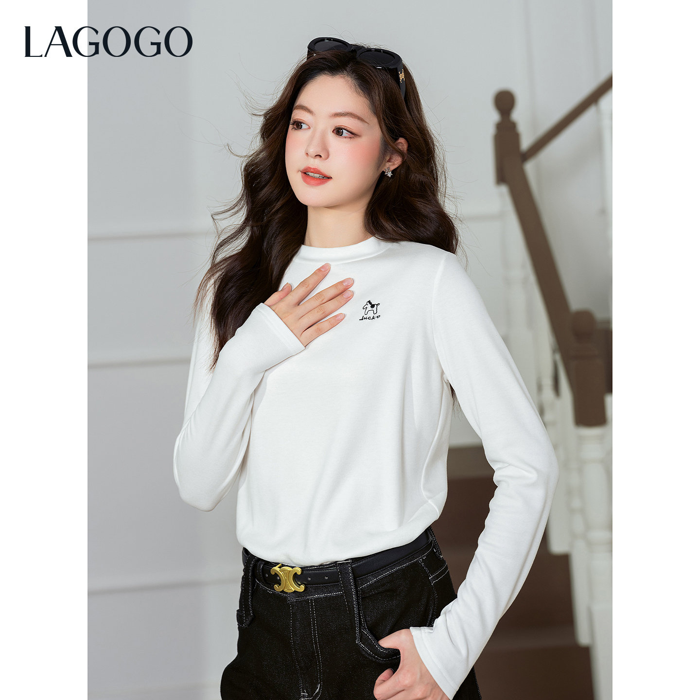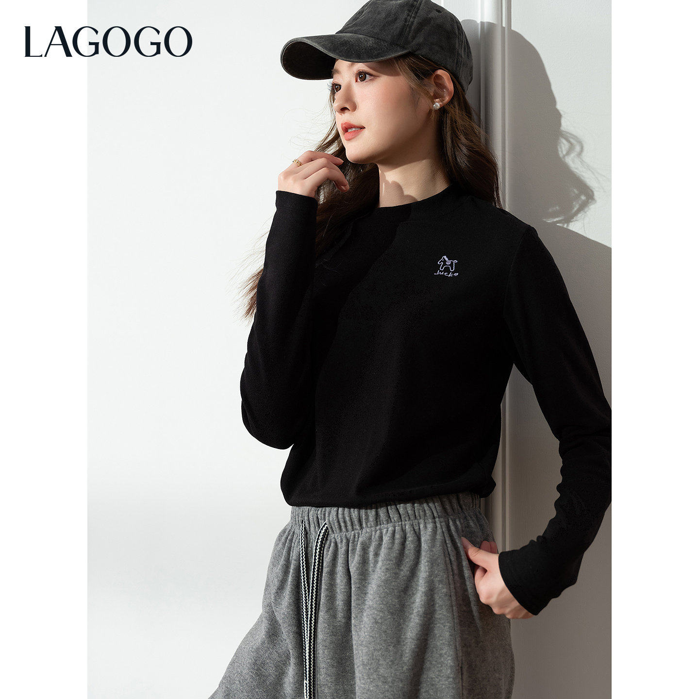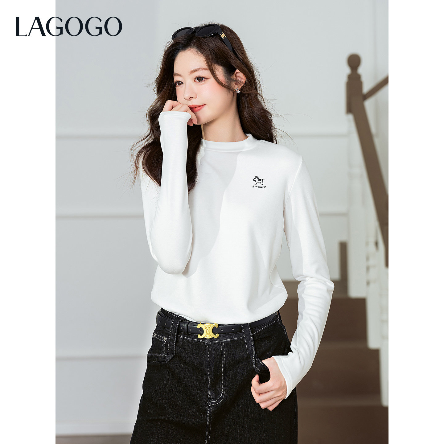优可丝亲肤抗皱LAGOGO幸运萌马半高领T恤拉谷谷2025冬新款打底衫