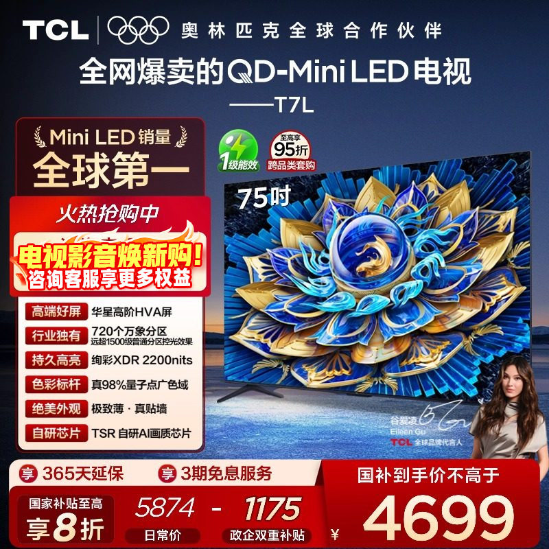 TCL电视 75T7L 75英寸 QD-Mini LED 万象分区 tcl电视机官方店65