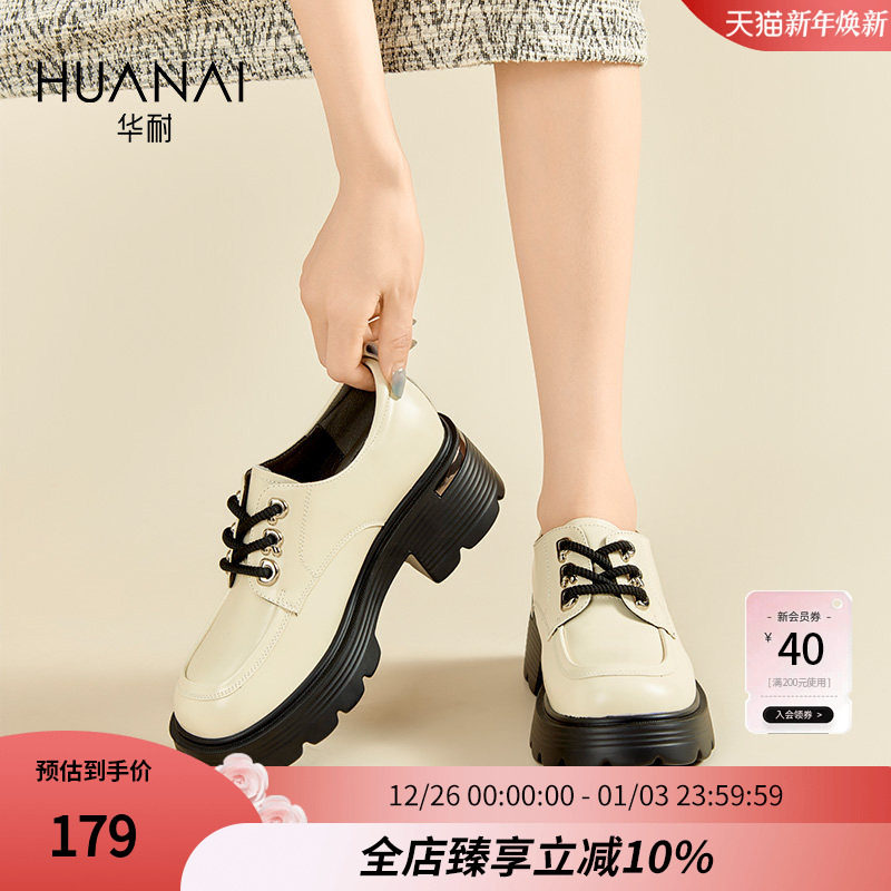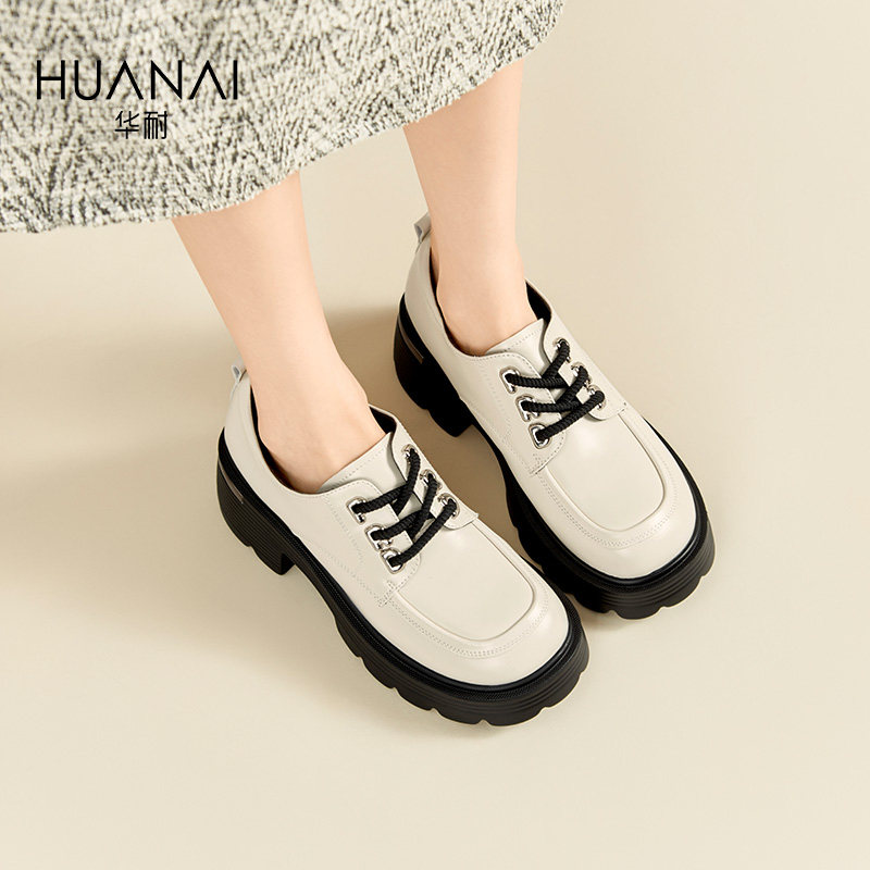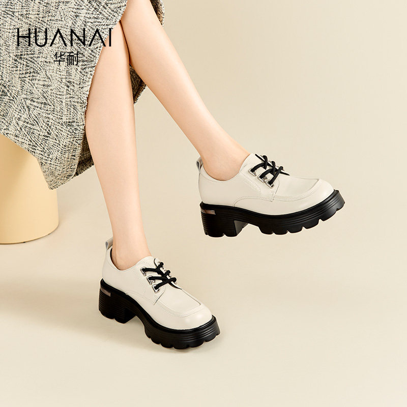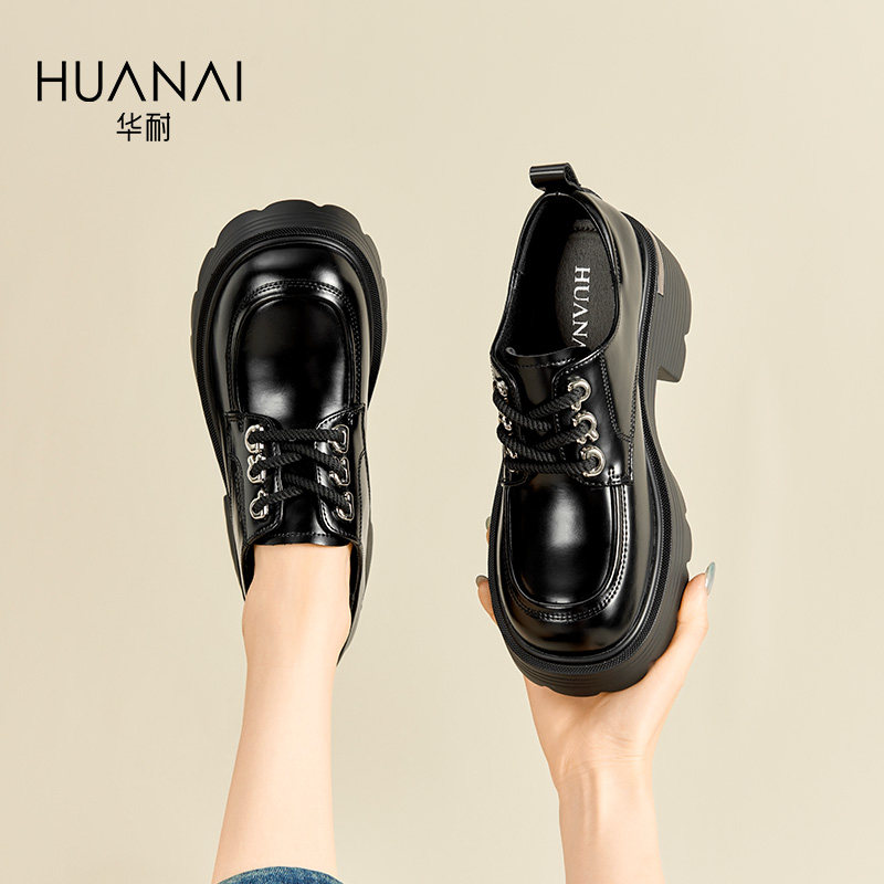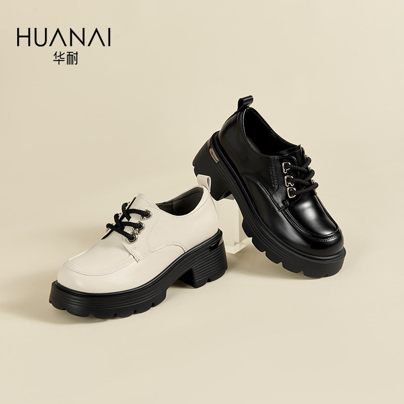 华耐厚底白色小皮鞋2025秋季系带学院风松糕底乐福鞋增高小黑鞋子