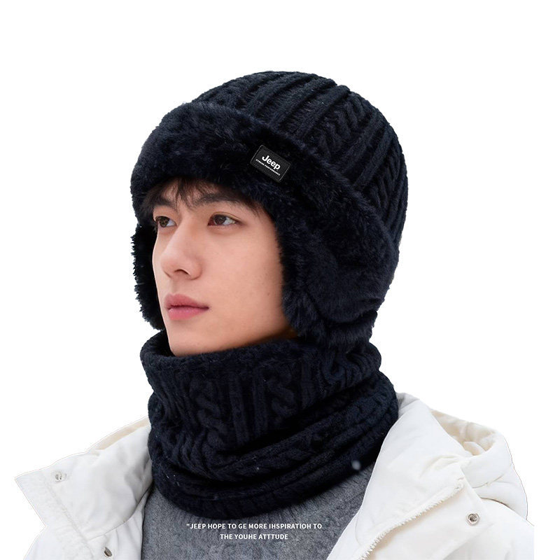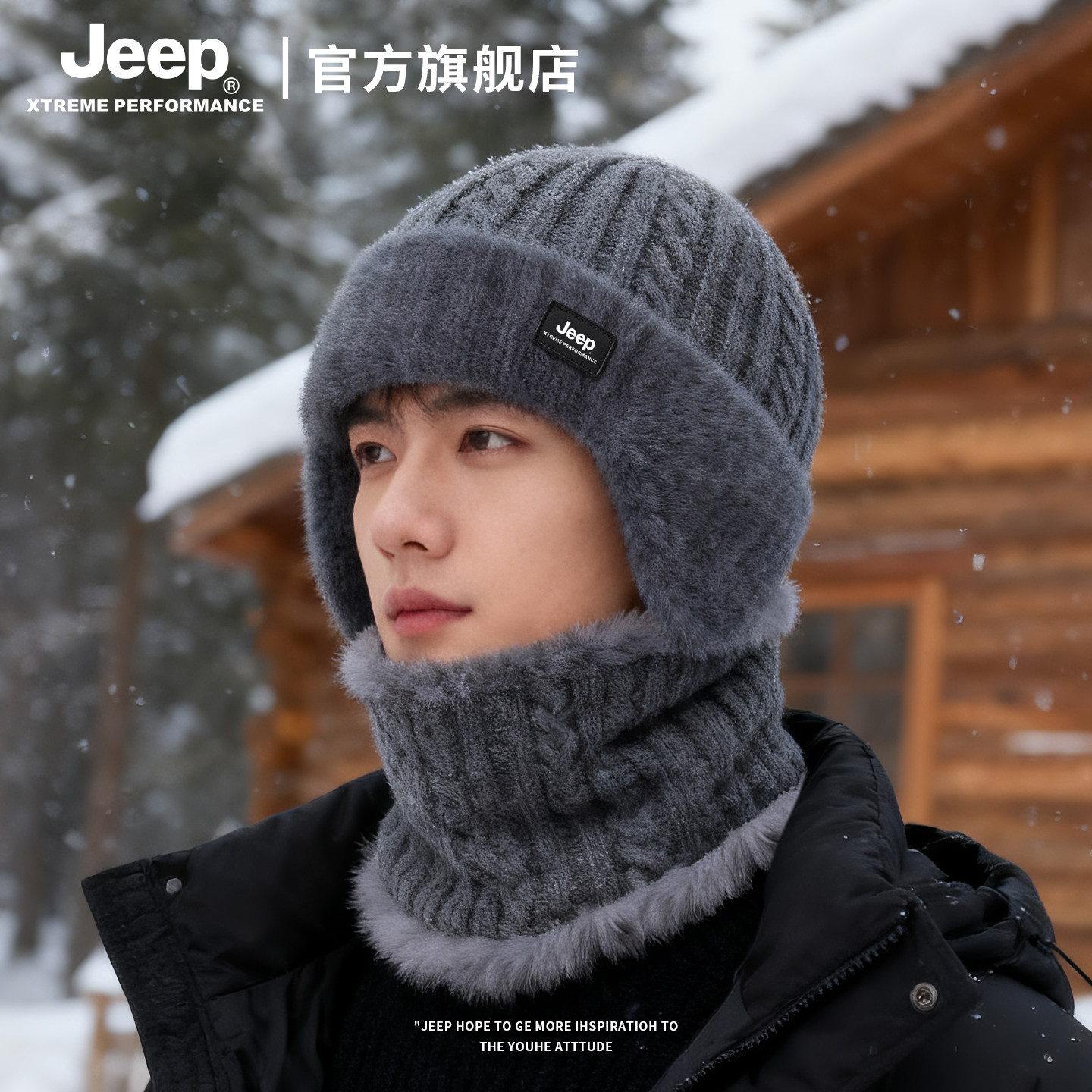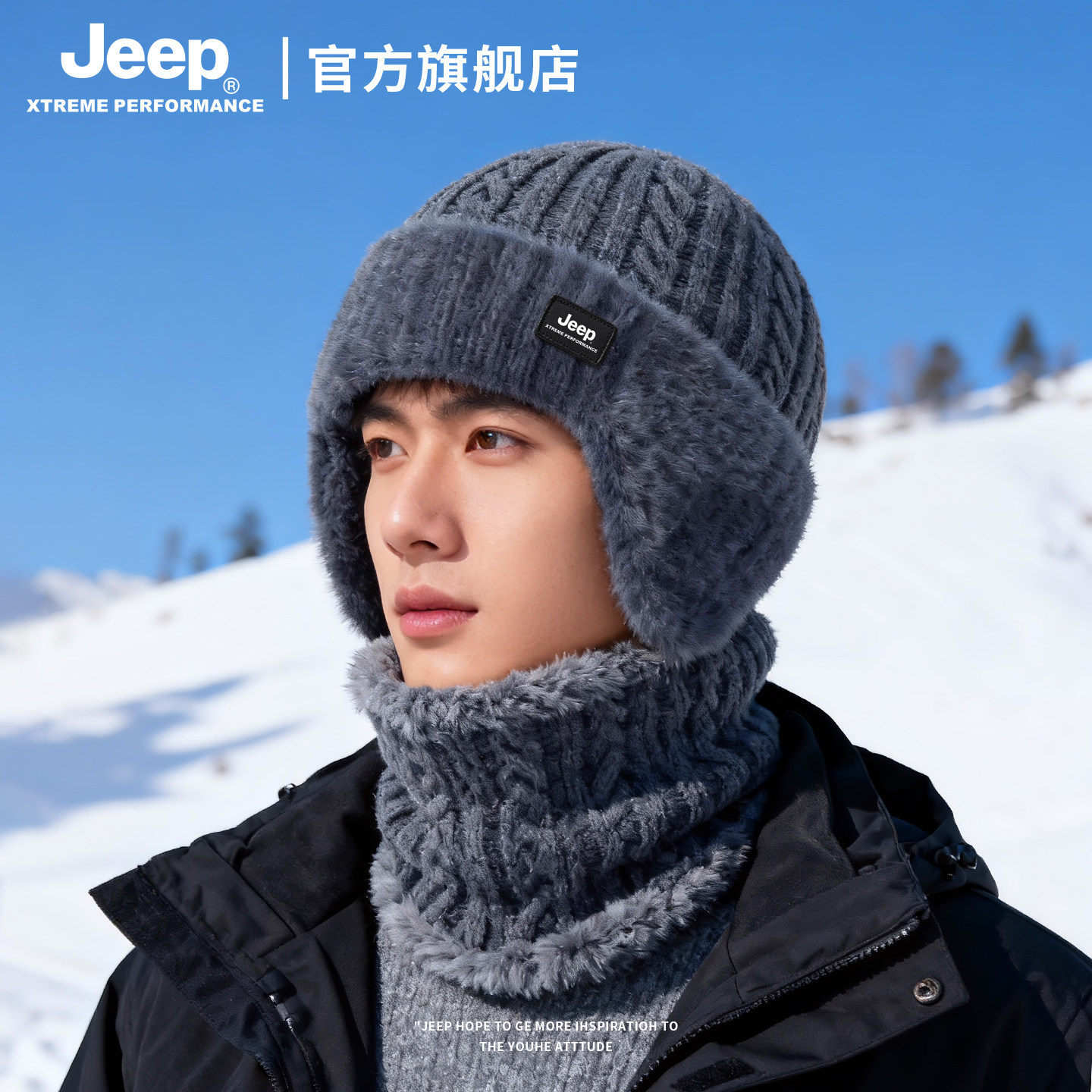 jeep吉普男士冬季毛线帽加绒保暖户外骑行围脖防风针织护耳帽子男