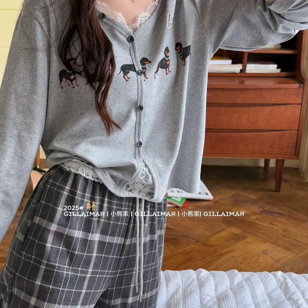 Gill Aimar小熊家秋季新款长袖纯棉睡衣女卡通小狗休闲格子韩版