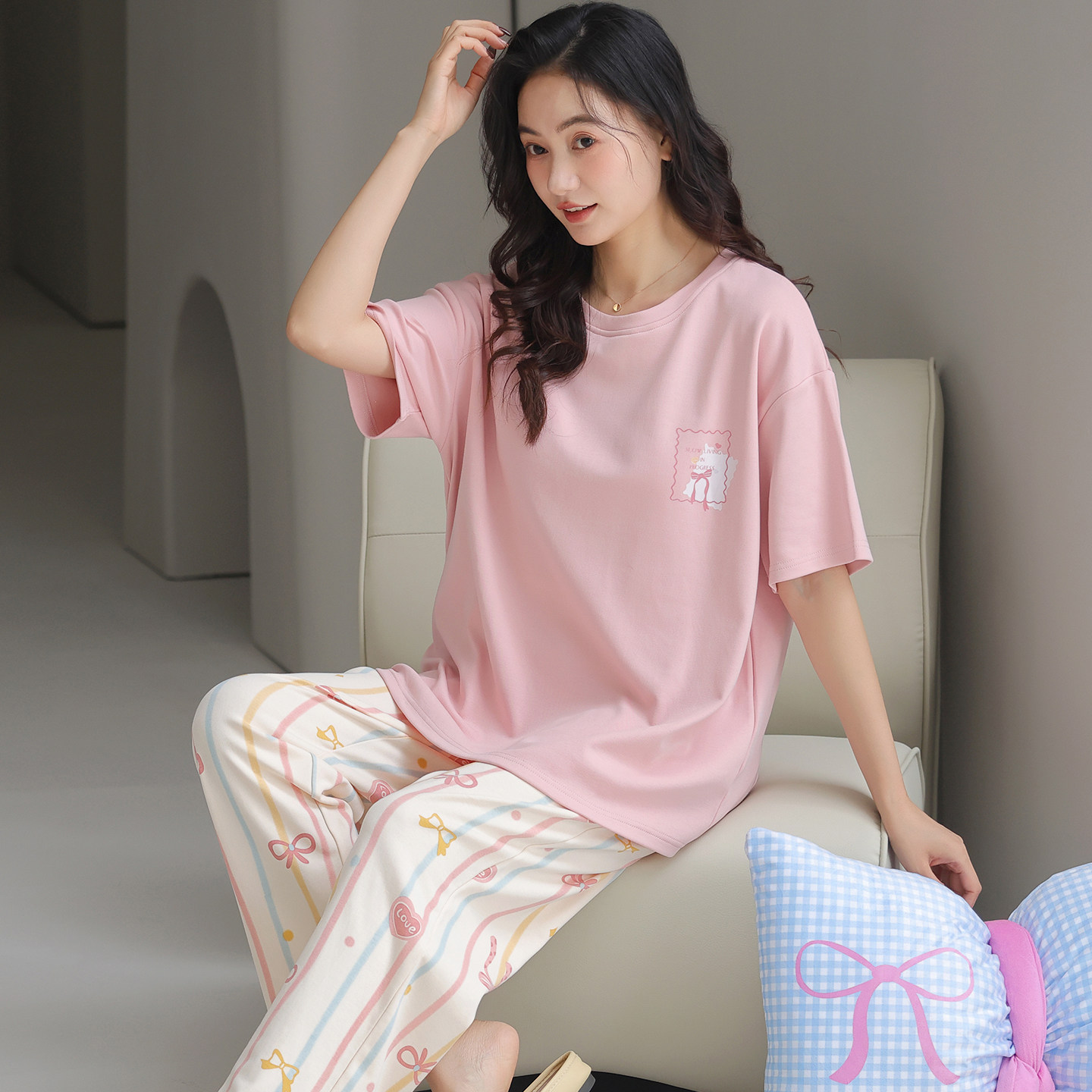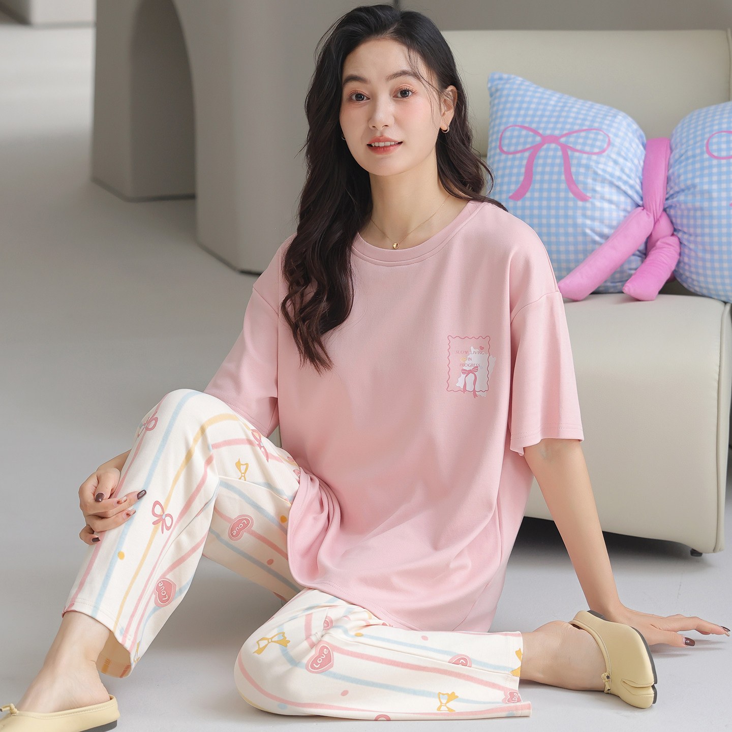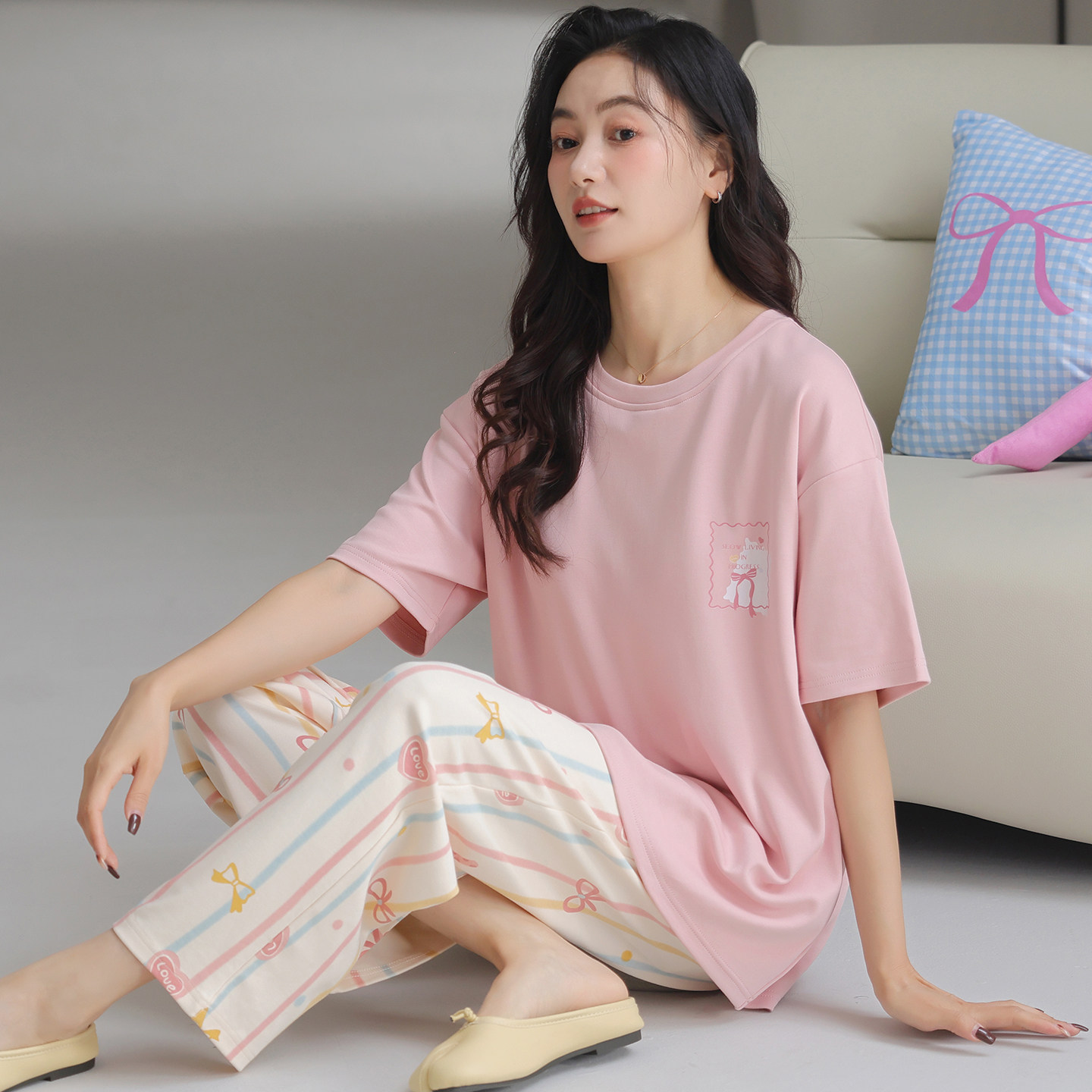 都市丽人睡衣女士2025新款夏季纯棉短袖长裤家居服套装甜美可爱