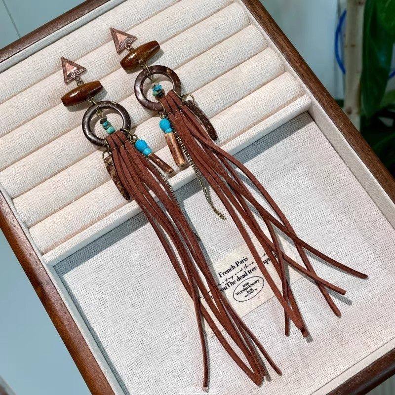 手作复古部落风天然木质皮绳流苏耳环木头串珠耳钉小众名族风水滴