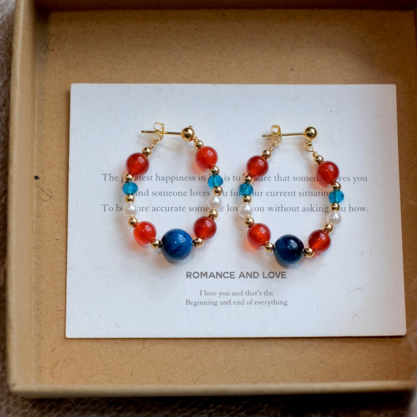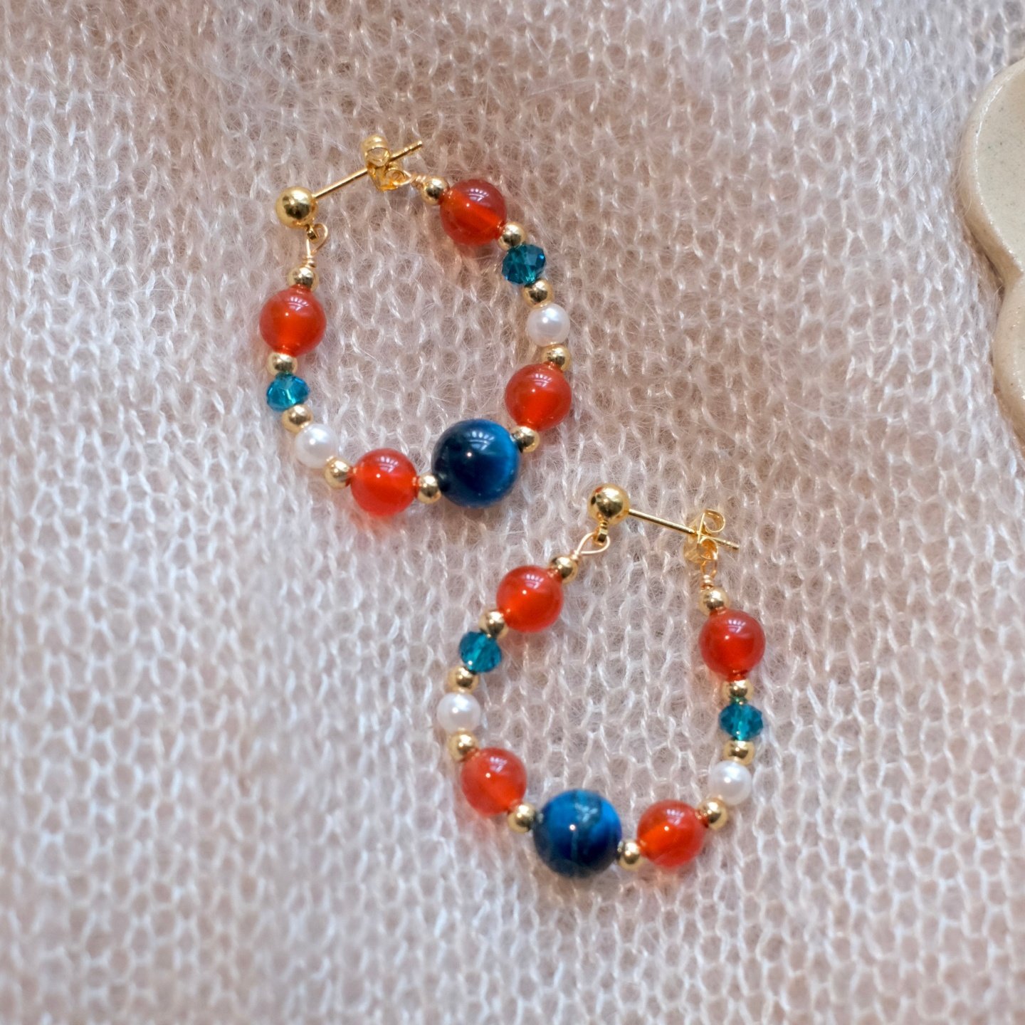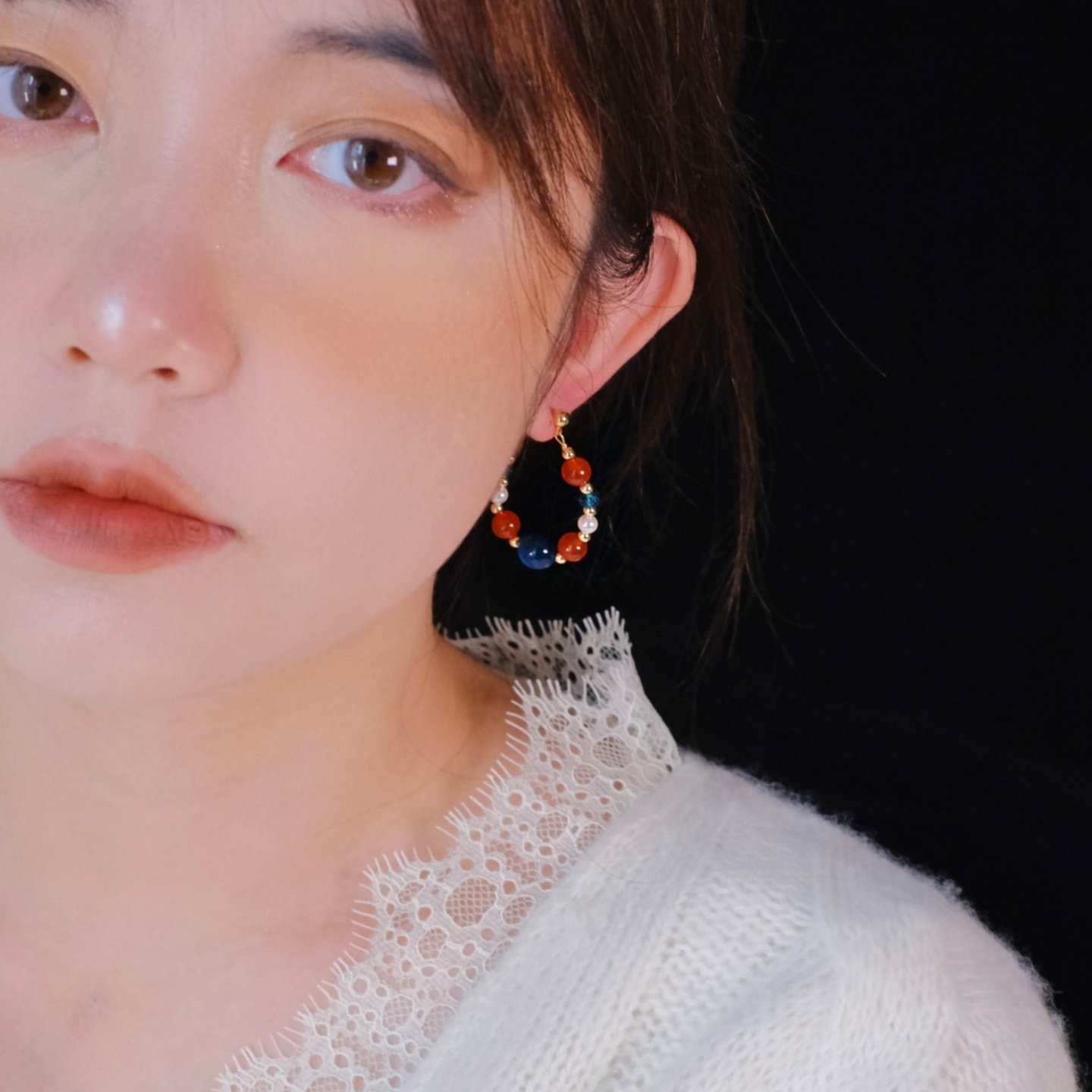 《红蓝撞色》新中式复古天然石红玛瑙串珠耳环耳圈耳夹小众耳饰女