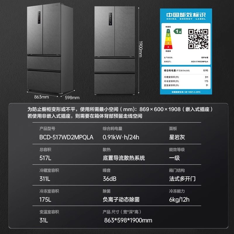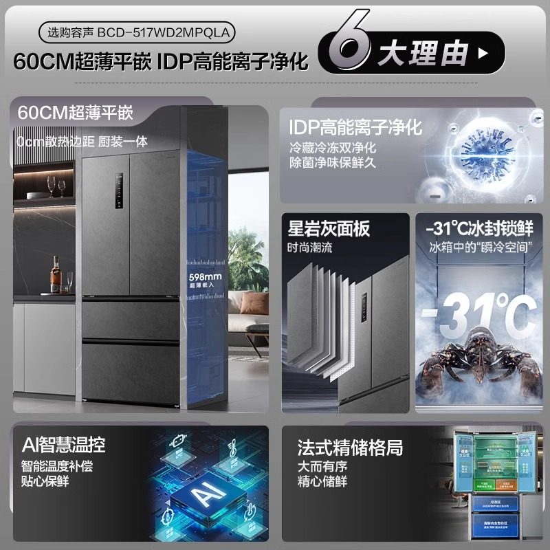 容声517WD2MPQLA法式四门超薄零嵌IDP双净一级节能变频风冷冰箱