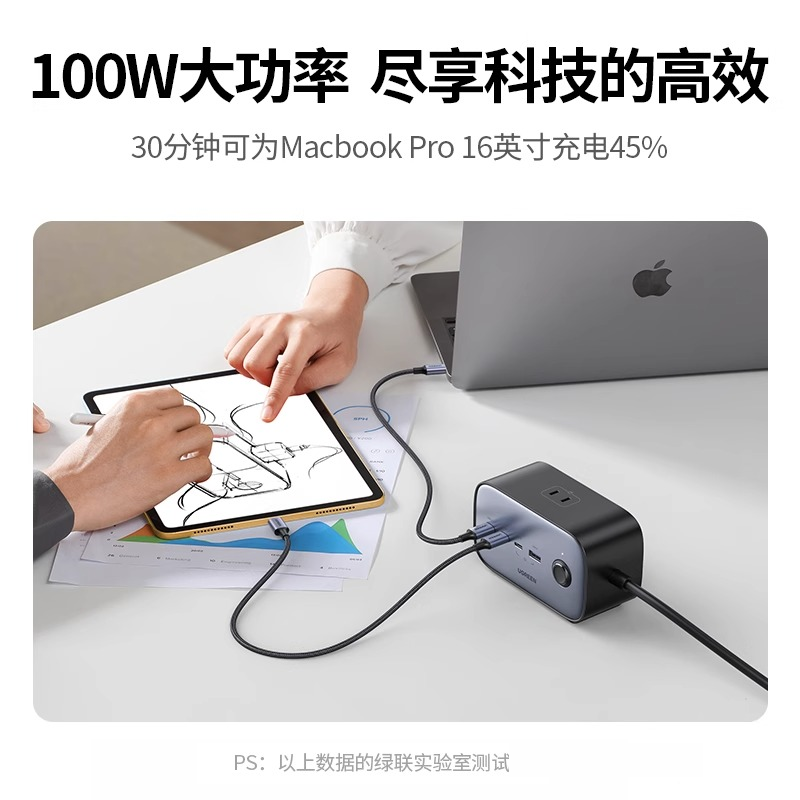 绿联魔盒100W桌面充电站多功能USB插座PD快充头多口适用苹果ipad手机电脑笔记本通用拓展插线板氮化镓充电器