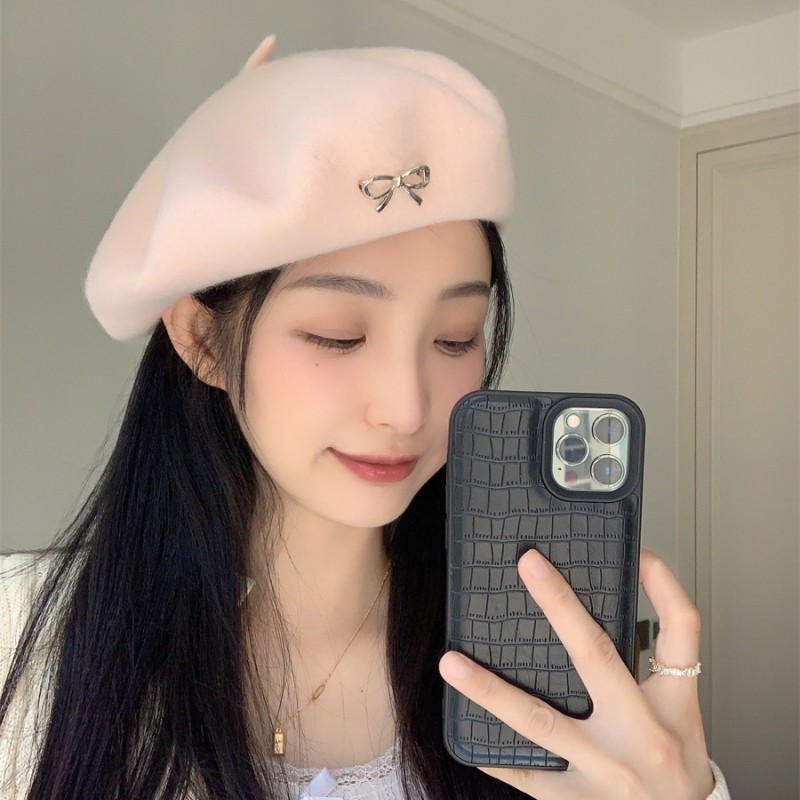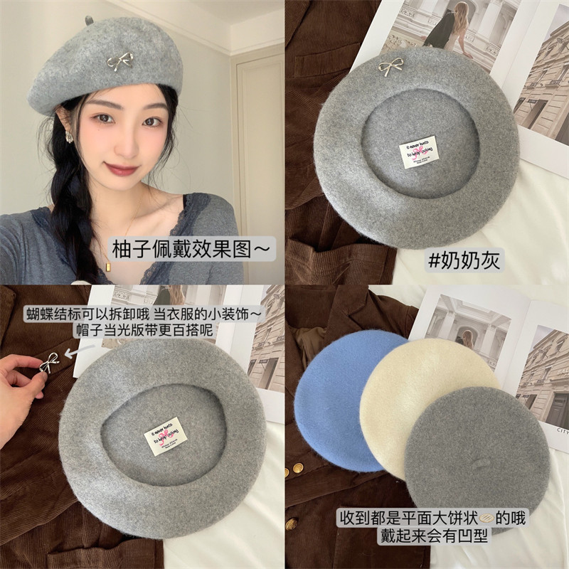 初秋穿搭~蝴蝶结羊毛贝雷帽女日系甜美百搭气质复古时尚画家帽潮