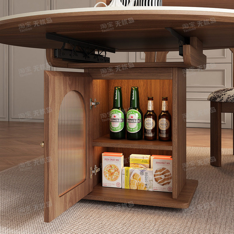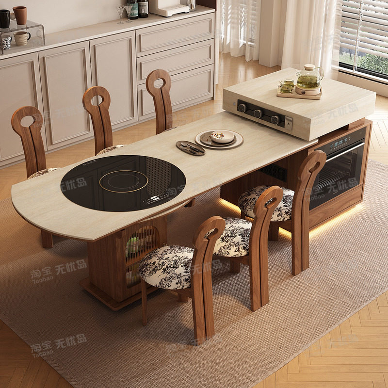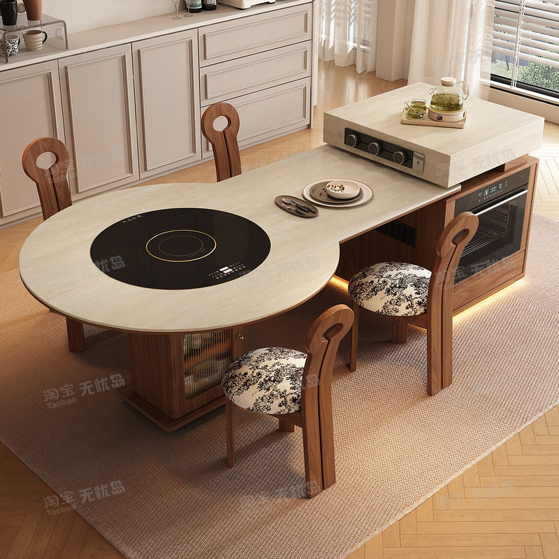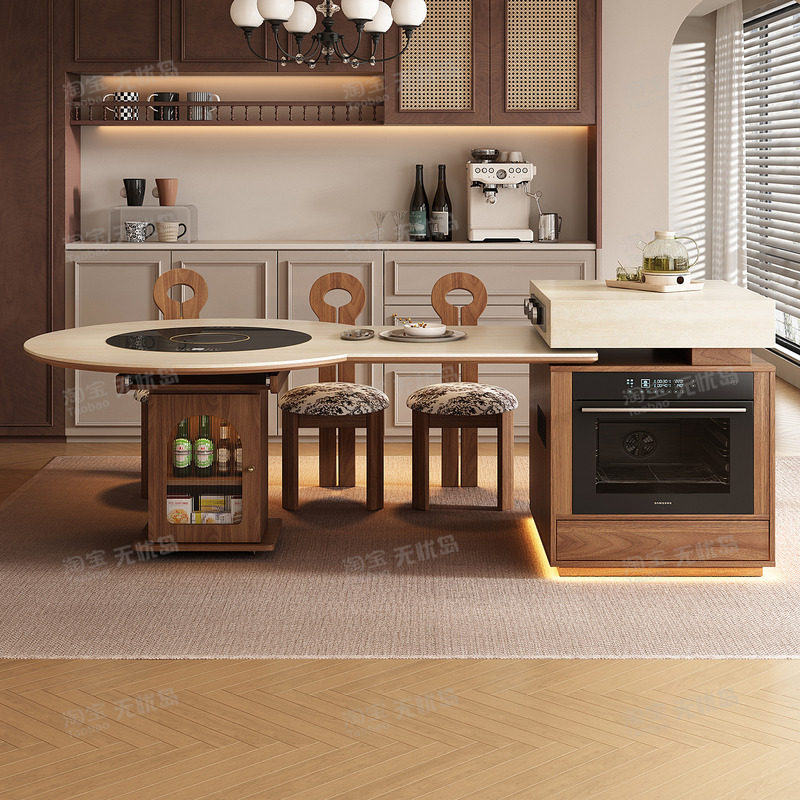 多功能可伸缩岛台餐桌一体可变圆桌中古风客餐厅高端储物中岛台