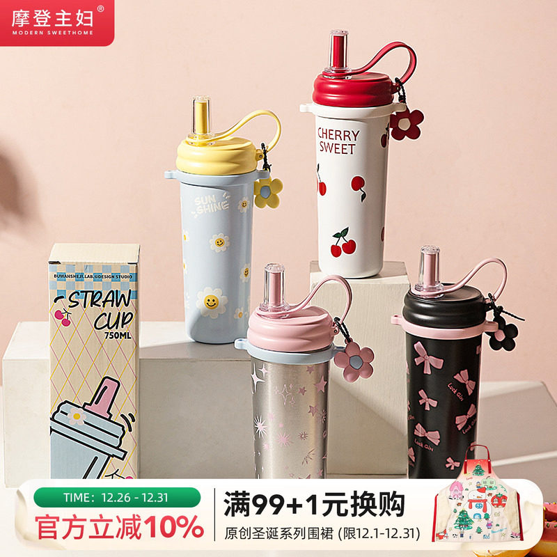 摩登主妇保温杯女生高颜值不锈钢吸管杯子女士2025新款大容量水杯