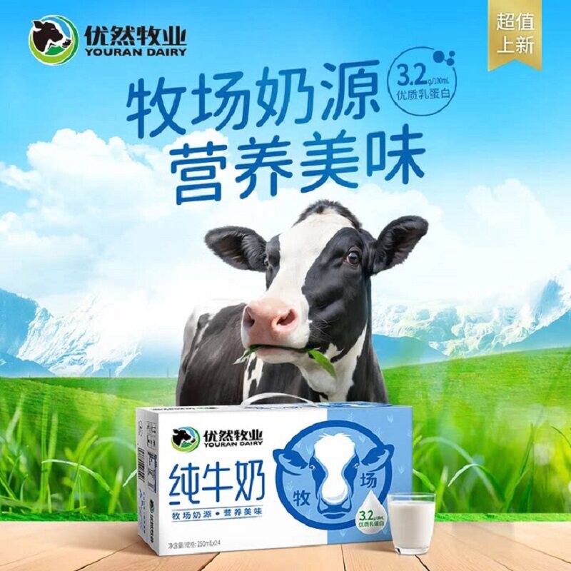 优然牧业纯牛奶250ml*24盒儿童纯奶牛奶学生早餐奶原生生牛乳