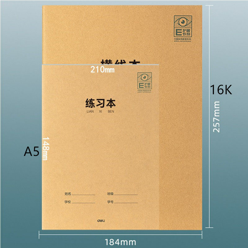 得力16K护眼专利牛皮纸阅读笔记本子软抄本记事本车线横线本中小学生加厚缝线作文本A5田字格本作业本练习簿