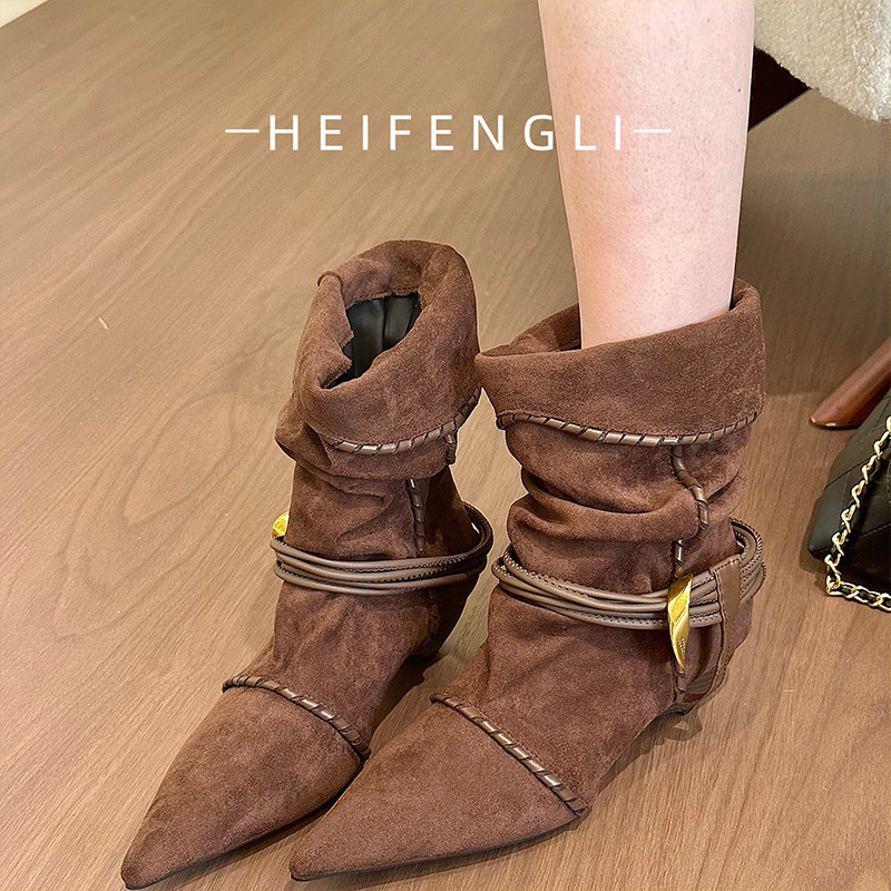小猫跟尖头褶皱绑带堆堆靴2025新款复古绒面翻边时装短靴粗跟磨砂