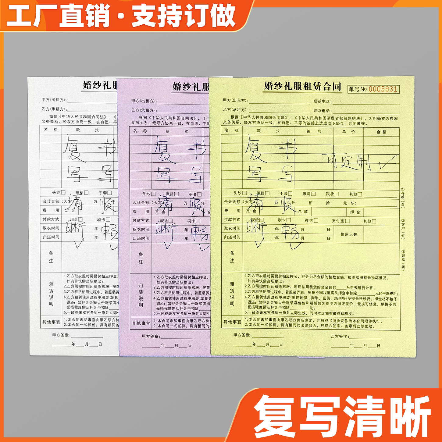 婚纱店租赁合同二联定制婚嫁礼服馆押金表新娘化妆跟妆单婚庆订单