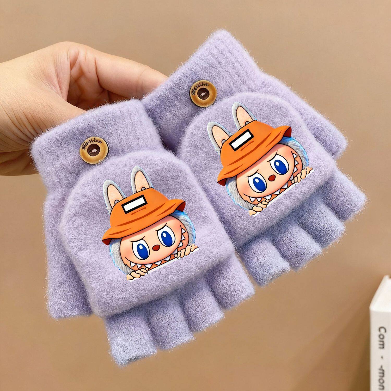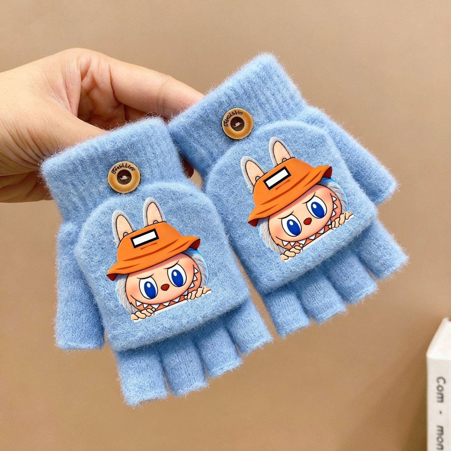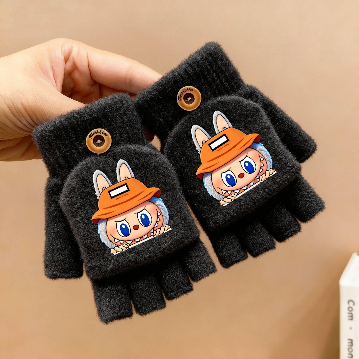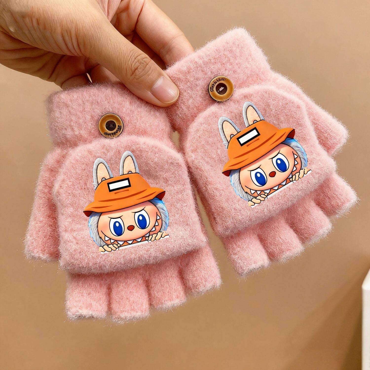 拉布儿童手套冬季男女童可爱保暖五指套加绒加厚翻盖写作业半指