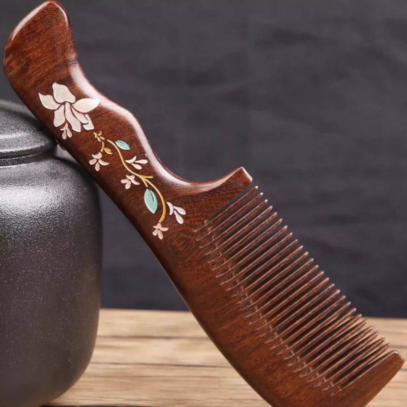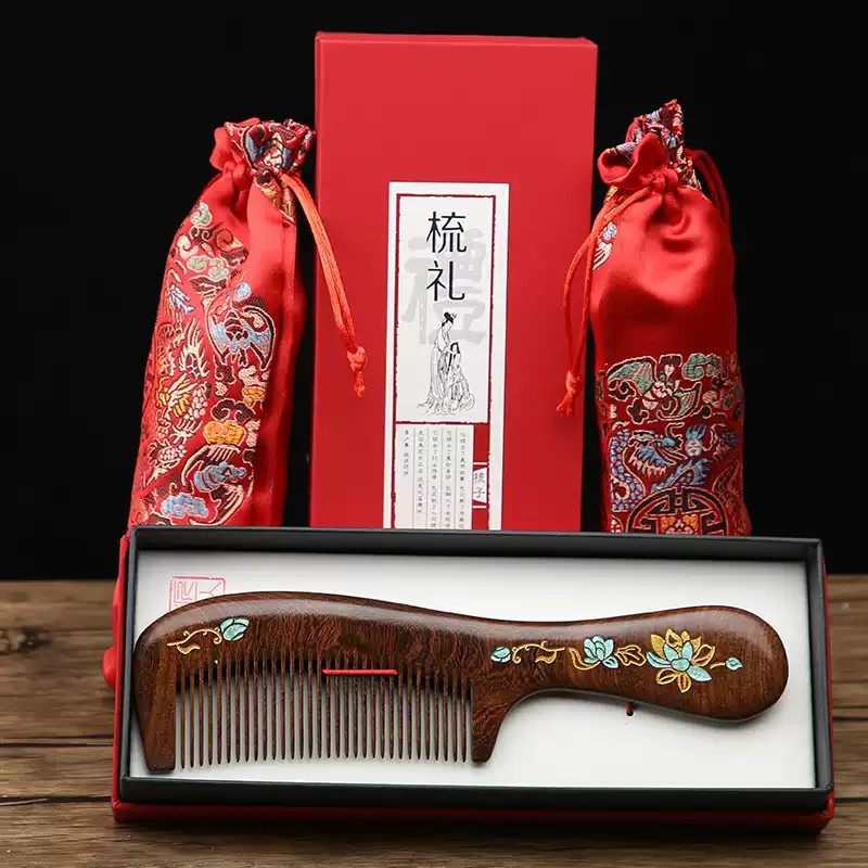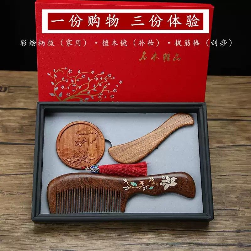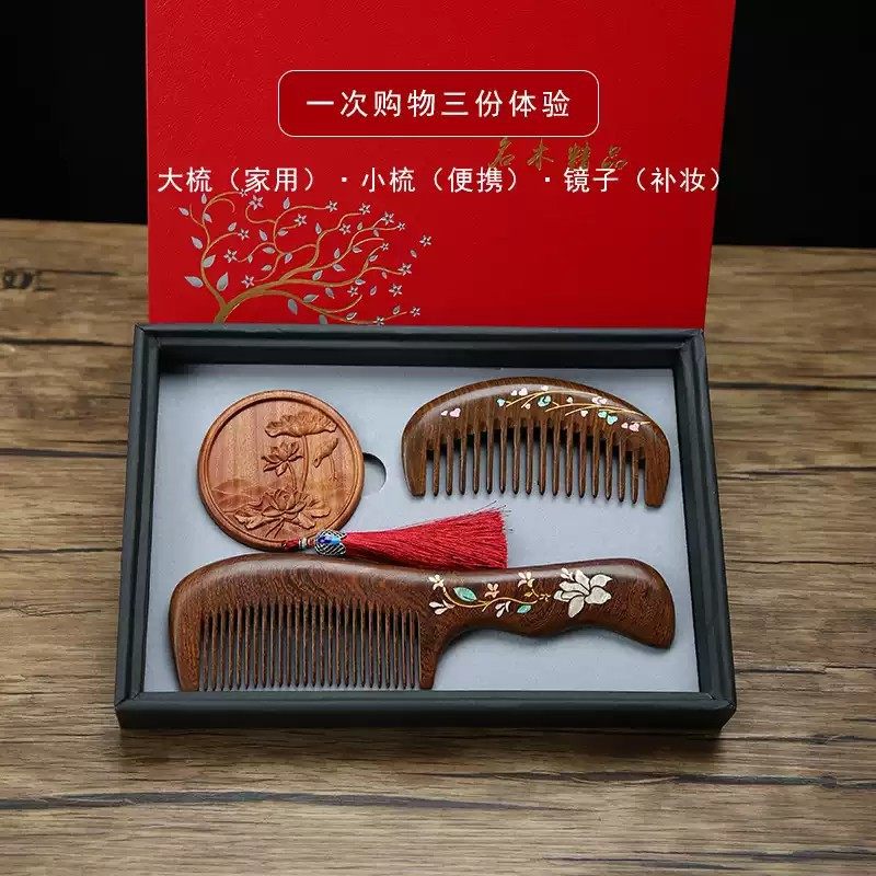 天然檀木梳子礼盒女士专用结婚一对镜子生日礼物送女朋友妈妈按摩
