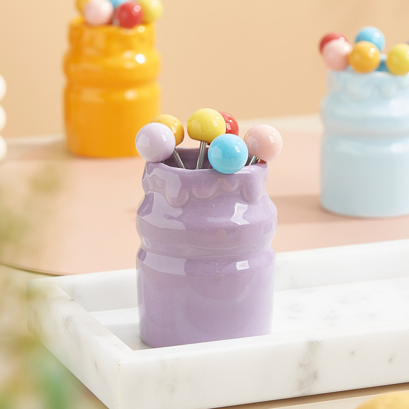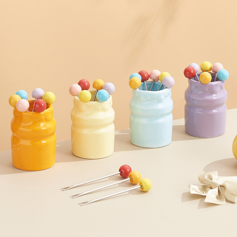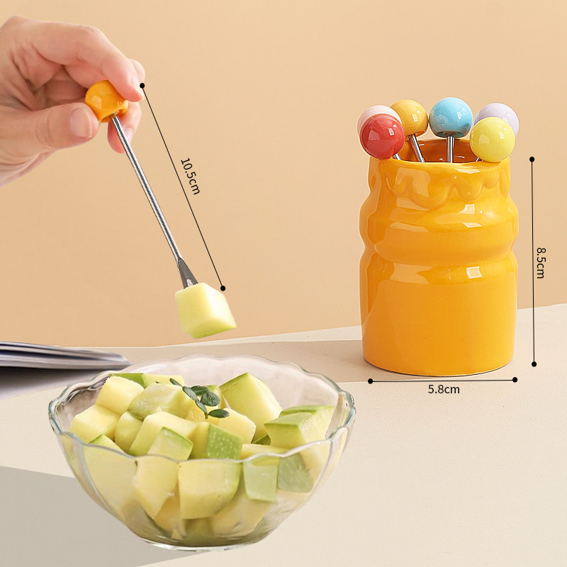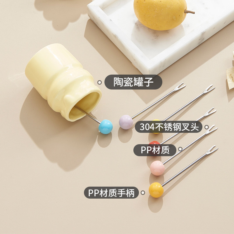 奶油风水果叉子套装陶瓷罐家用收纳可爱水果签下午茶蛋糕甜品叉