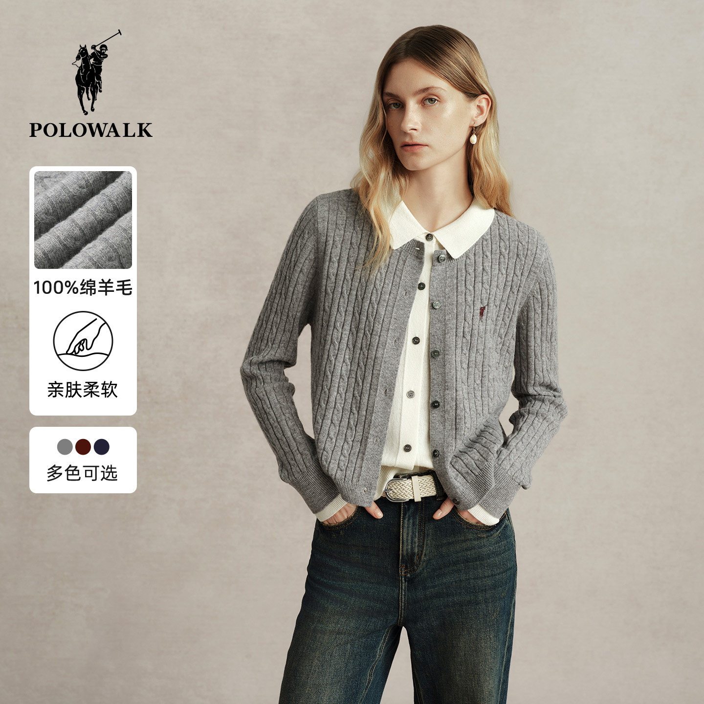【特惠】POLOWALK羊毛衫女式秋冬新款条纹百搭薄款100%绵羊毛开衫