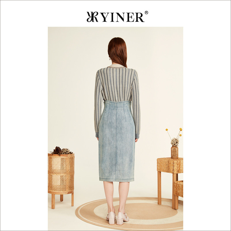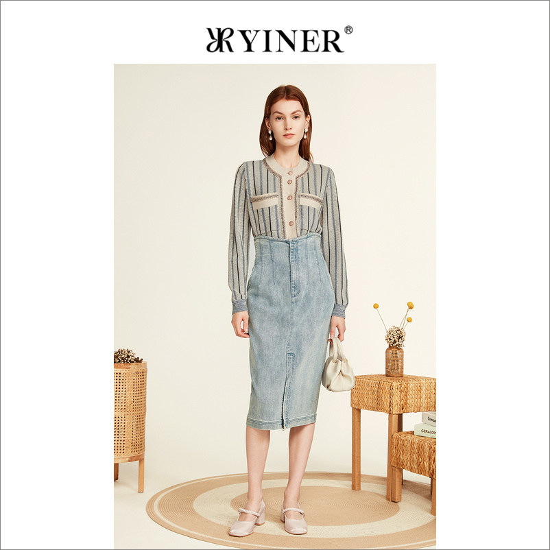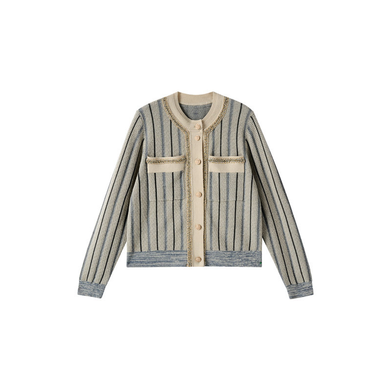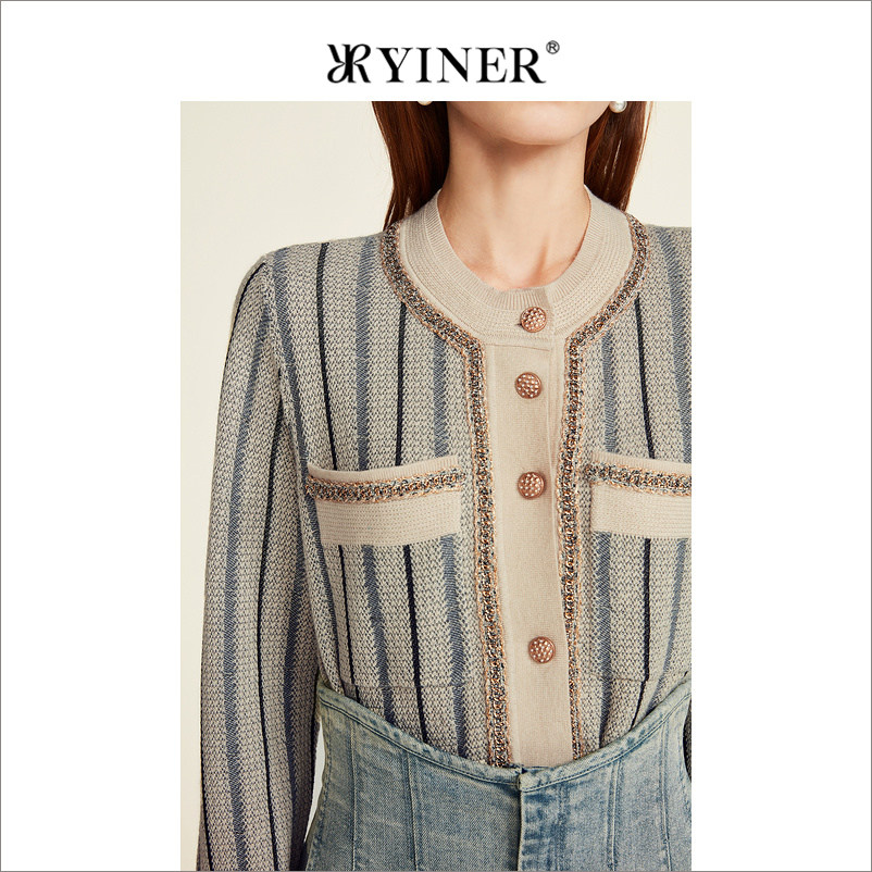 YINER音儿专选女装冬季时尚小香风粗花呢装饰竖条纹针织开衫