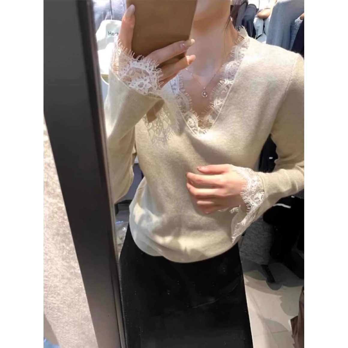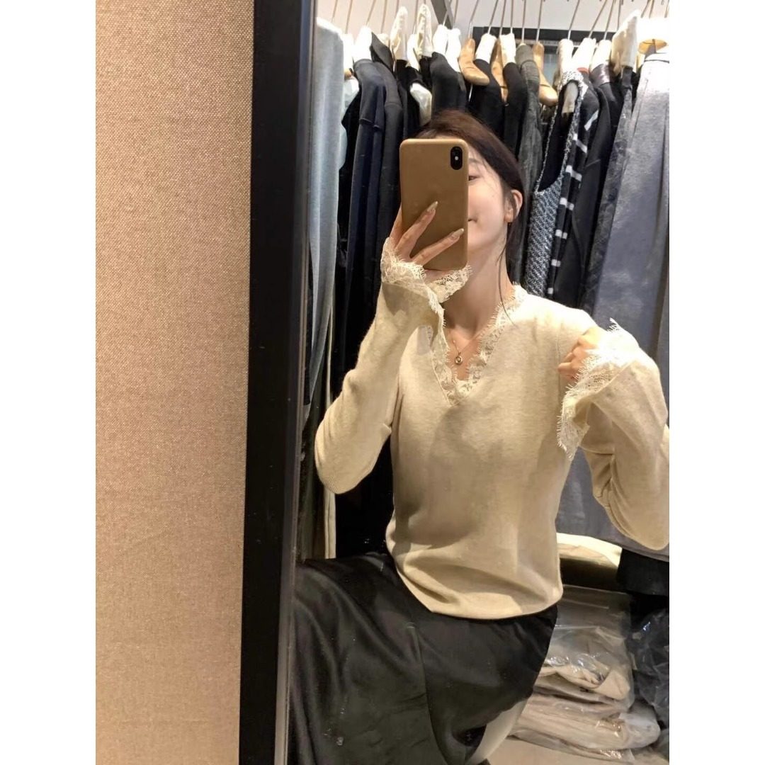 大码蕾丝长袖针织衫女装2025新款秋季内搭打底衫胖MM遮肉显瘦上衣