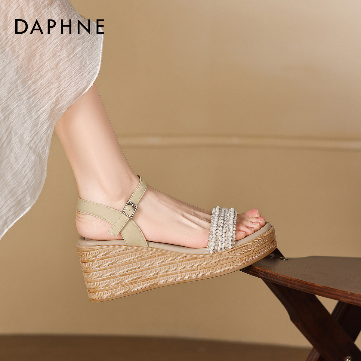 达芙妮度假风一字带凉鞋女2026新款春夏坡跟外穿松糕鞋白色高跟鞋