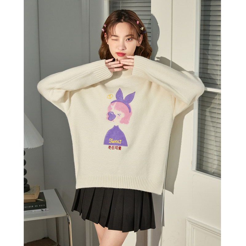 NVPVVA 秋冬百搭LOGO米粒绣圆领毛衣韩系宽松慵懒风针织衫上衣女