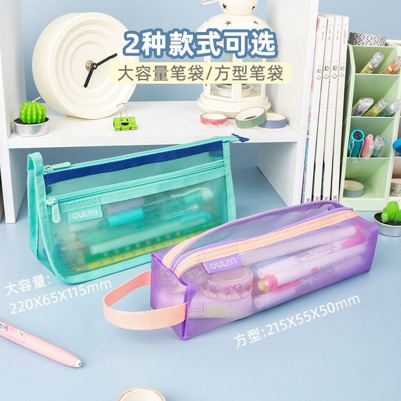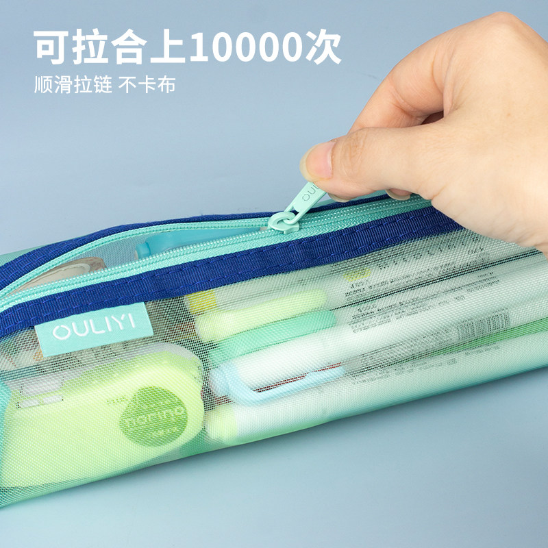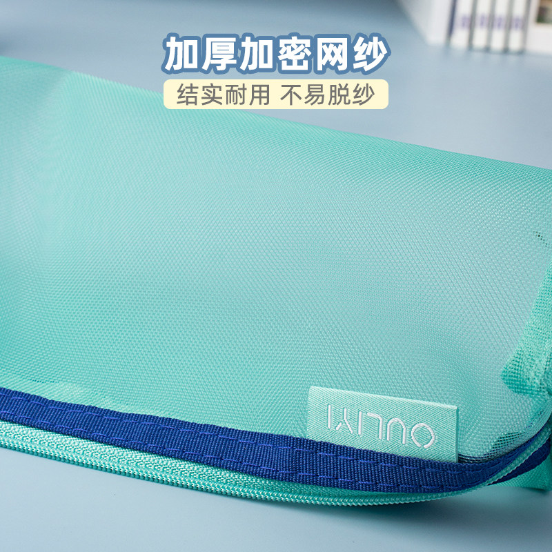 欧力益简约透明笔袋大容量2024年新款流行中学生文具袋女孩高颜值便携多功能男孩小学生手提立式纯色网纱袋