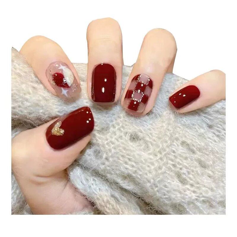 过年酒红美甲穿戴贴片假指甲甲片中长款秋冬酒红色新年显白法式