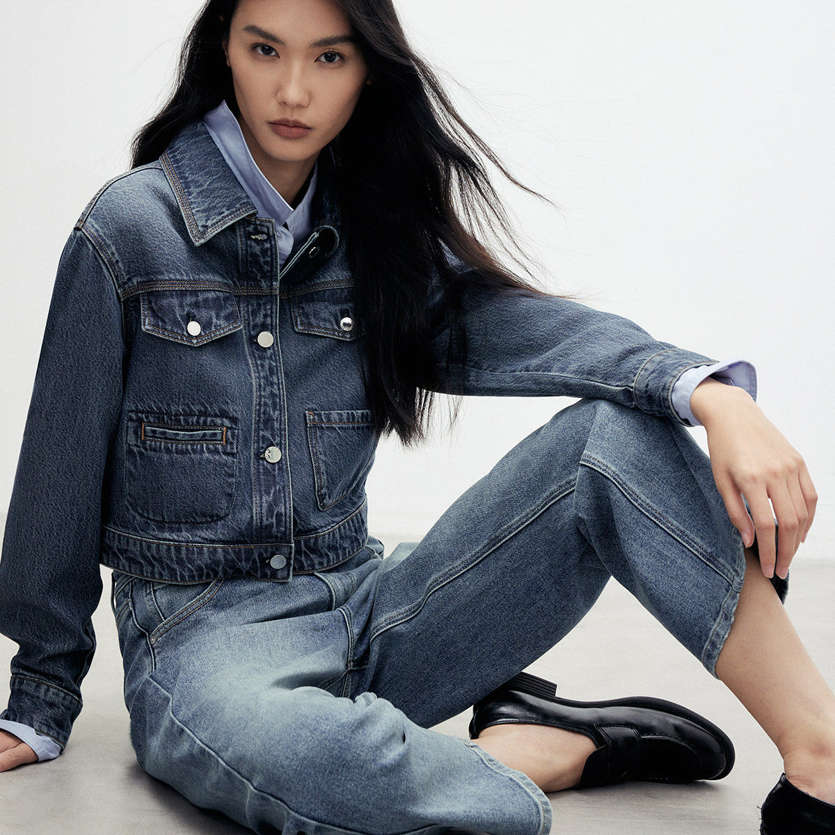 twosweet【超级裤神】四面弹重塑大长腿高腰直筒微喇叭原色牛仔裤