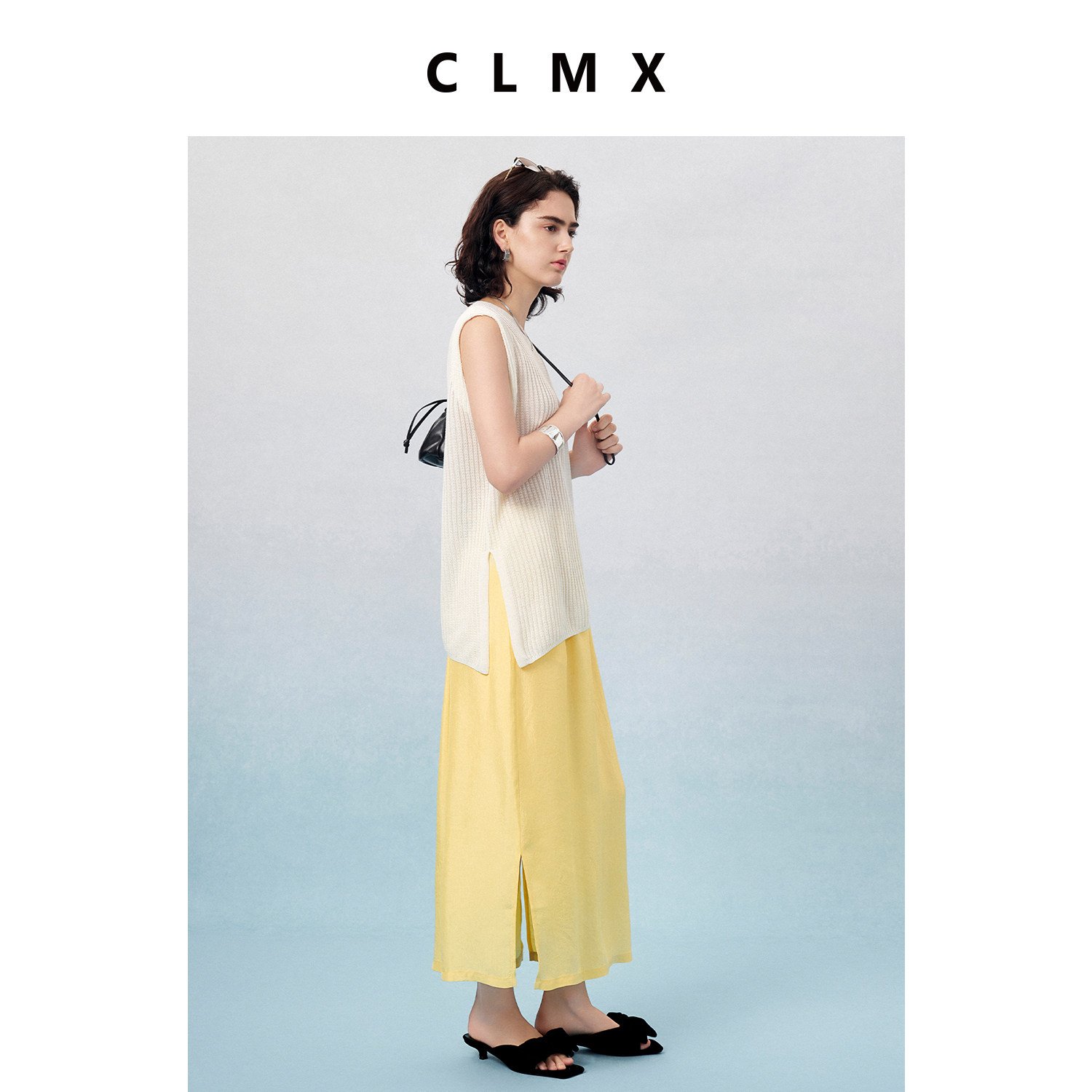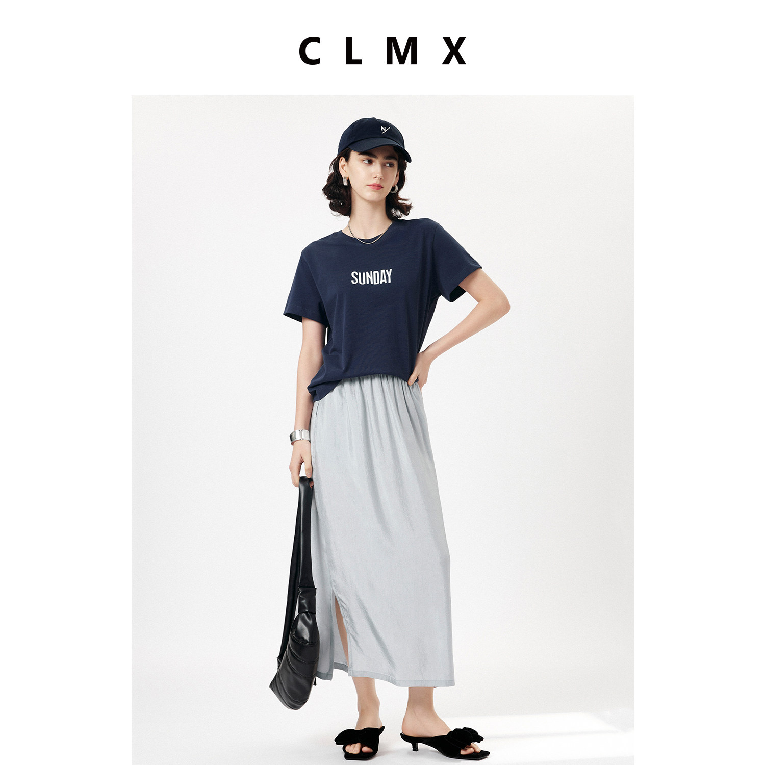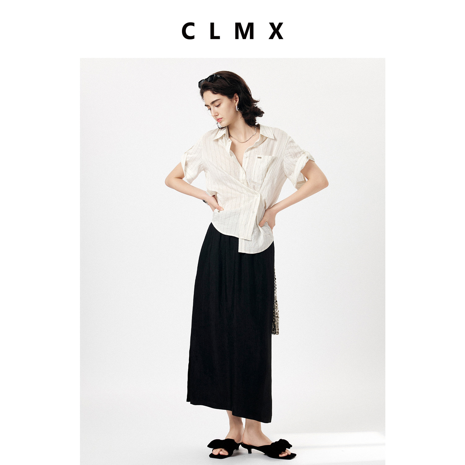 CLMX夏季简约长裙悬垂灵动自然微皱感醋酸面料压褶侧开衩半身裙女