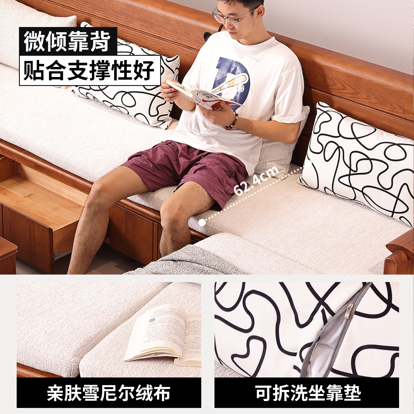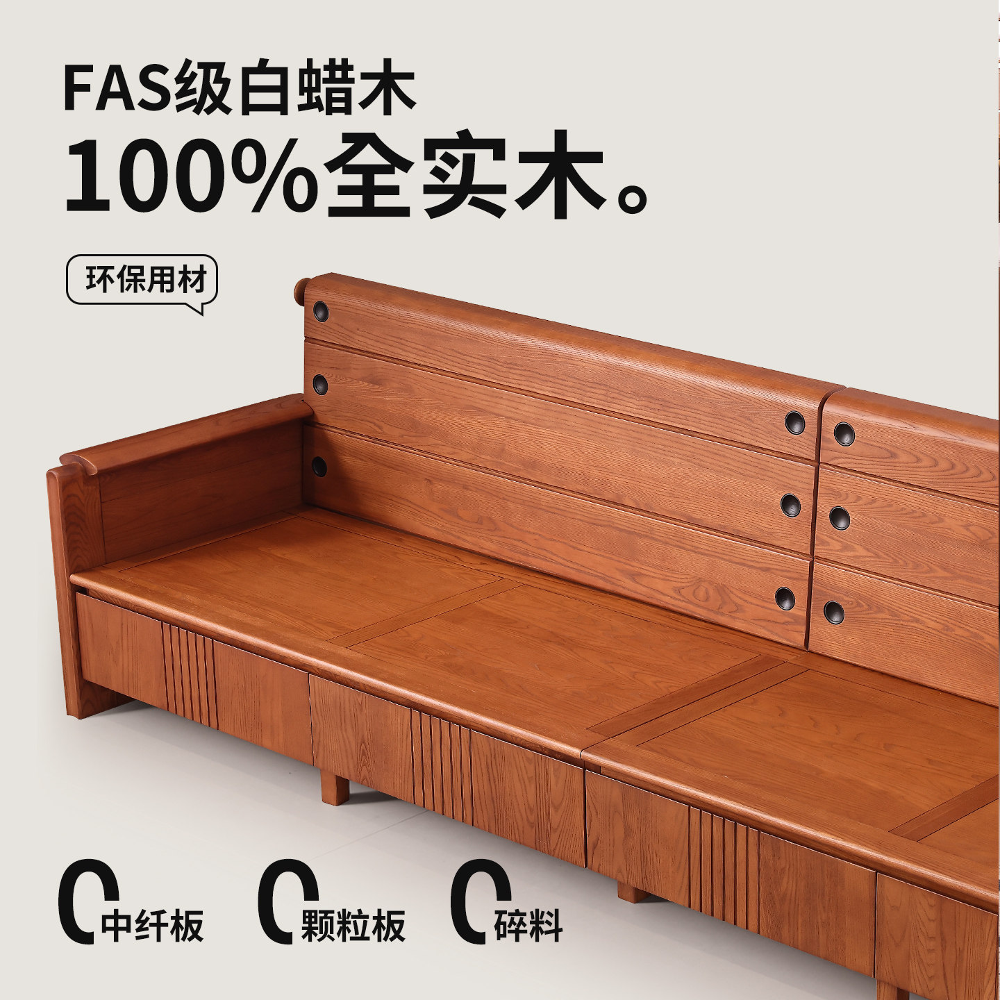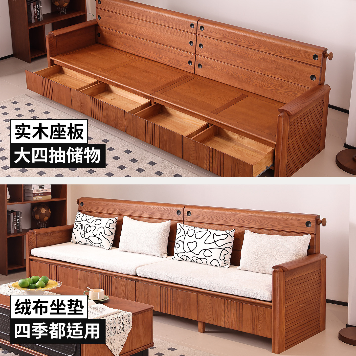 一林半舍中古风纯实木白蜡木沙发客厅组合复古风实木抽屉储物沙发