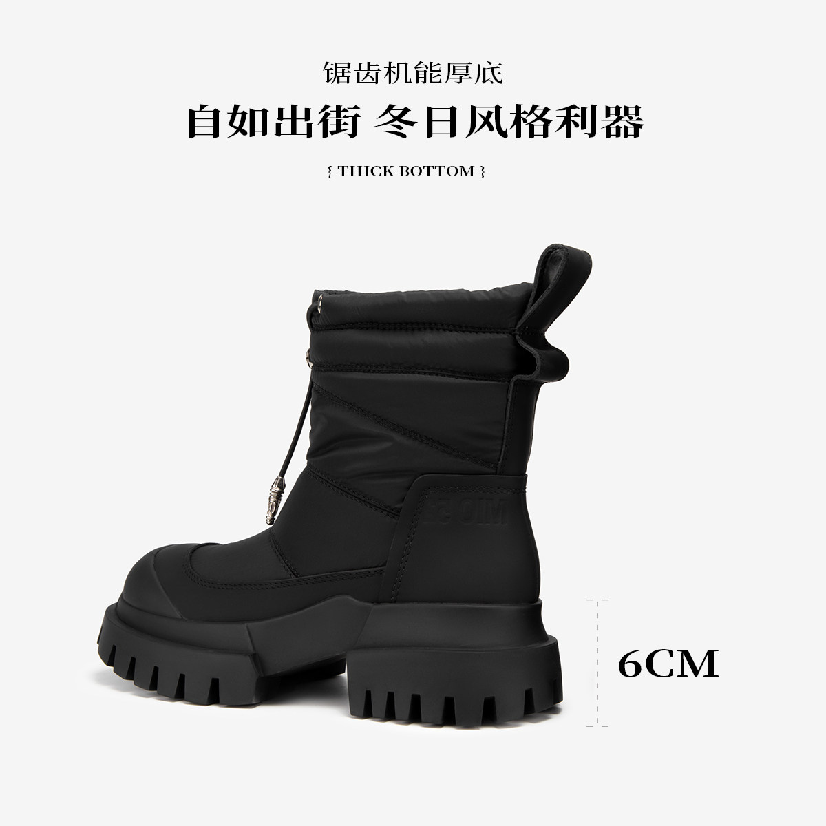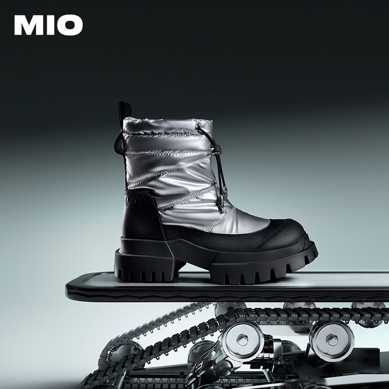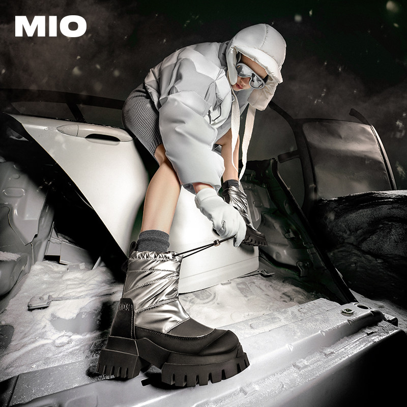 MIO米奥束带雪地靴冬季厚底高跟圆头休闲保暖时尚女银色机车短靴