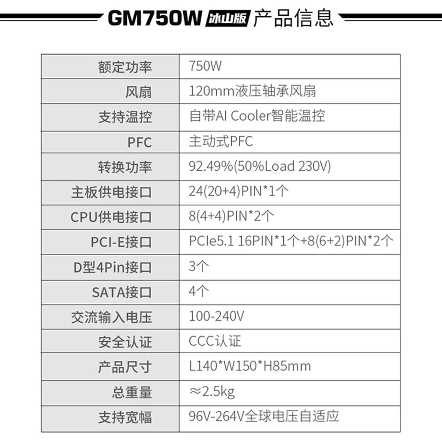 鑫谷GM650W/750W/850W冰山白色金牌全模组ATX3.1静音温控电脑电源