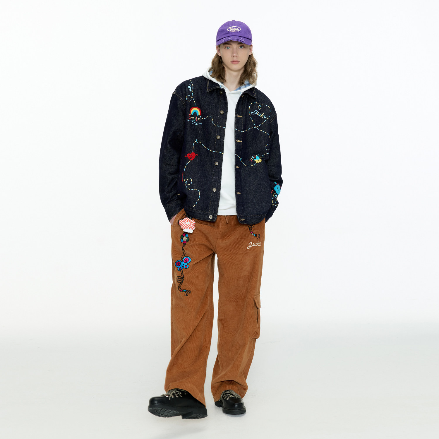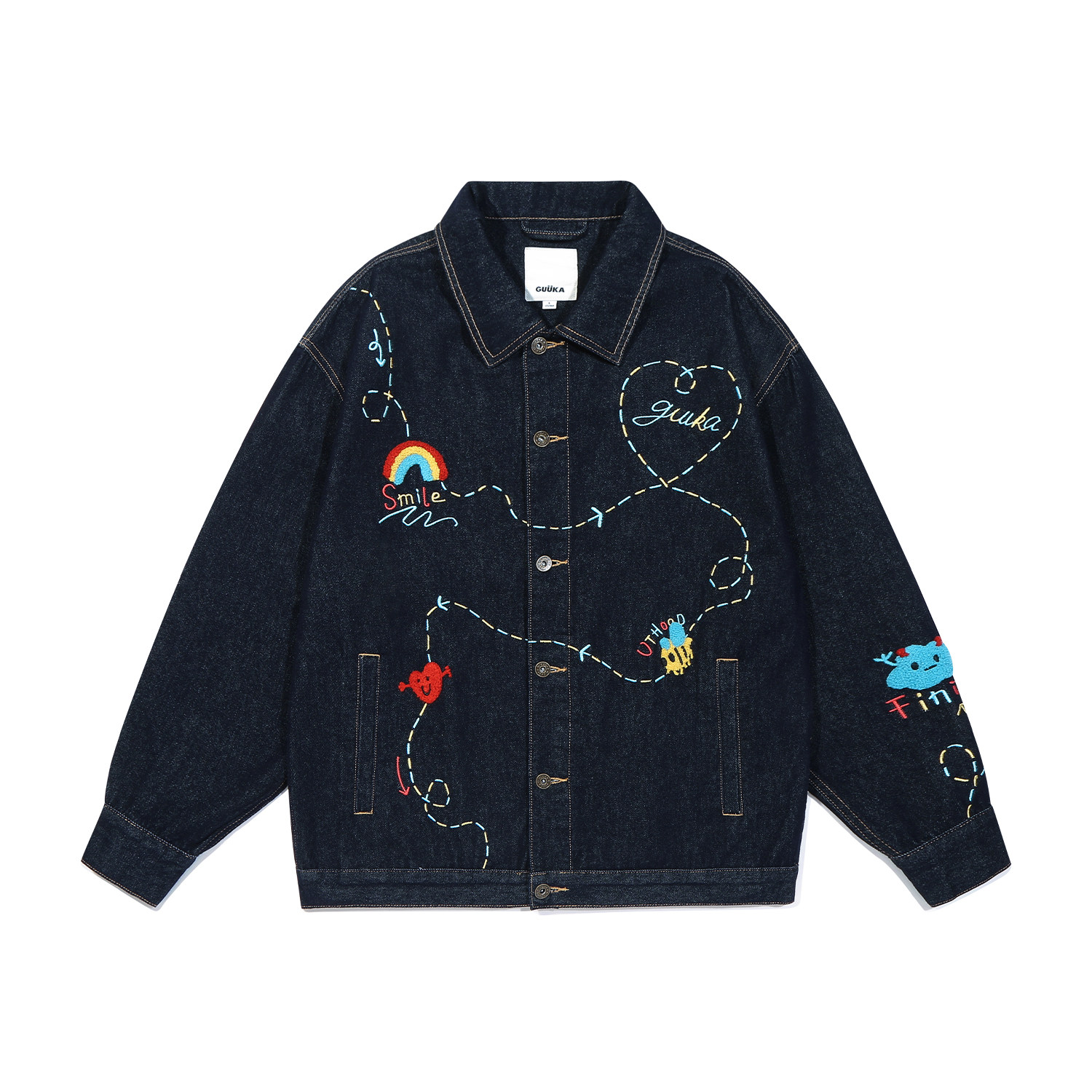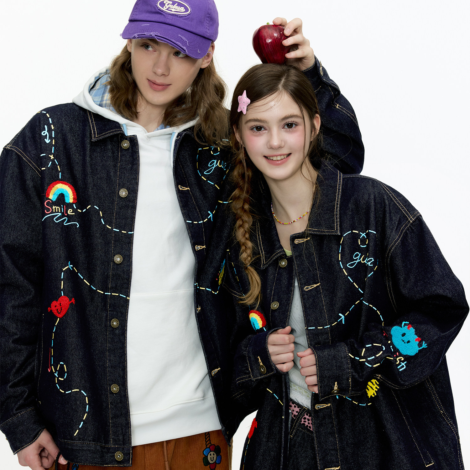 李耕耘同款GUUKA潮牌美式牛仔外套男 情侣爱心刺绣夹克女套装正肩
