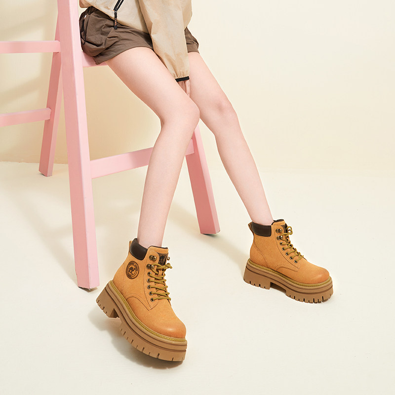 天美意厚底增高加绒英伦马丁靴大黄靴女鞋子休闲短靴皮靴冬季新款
