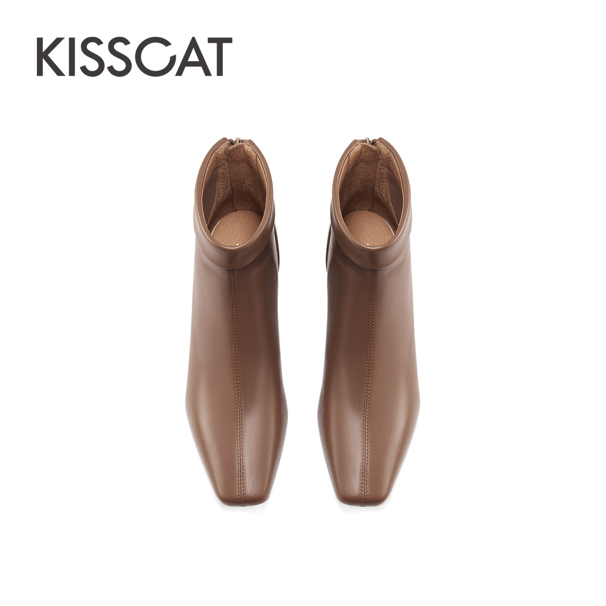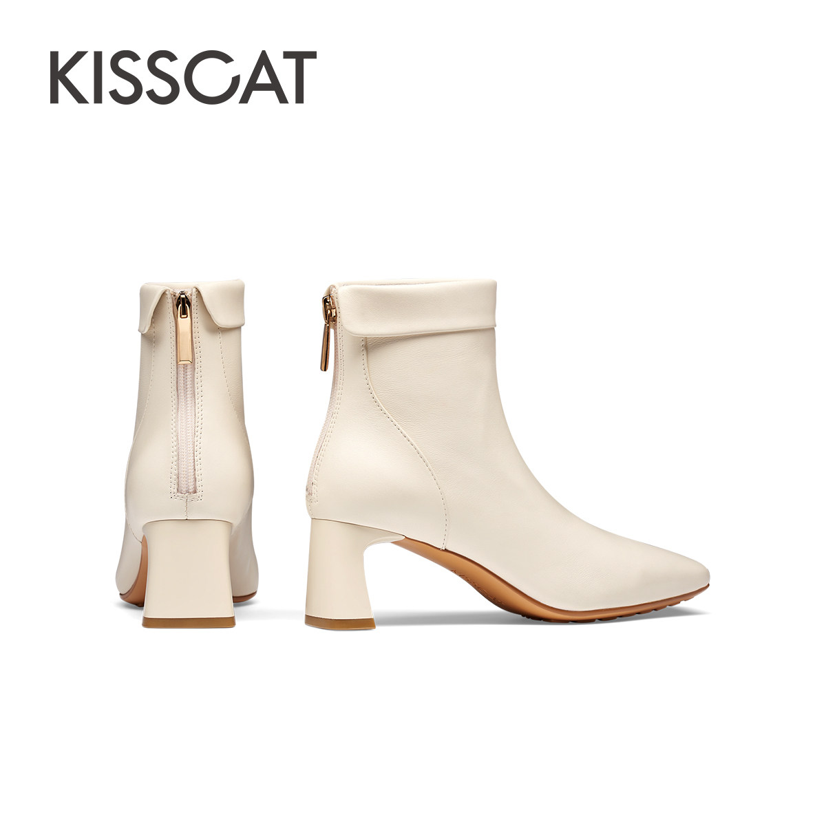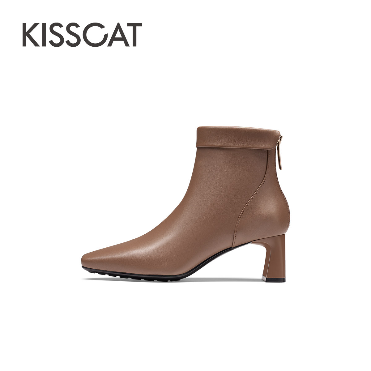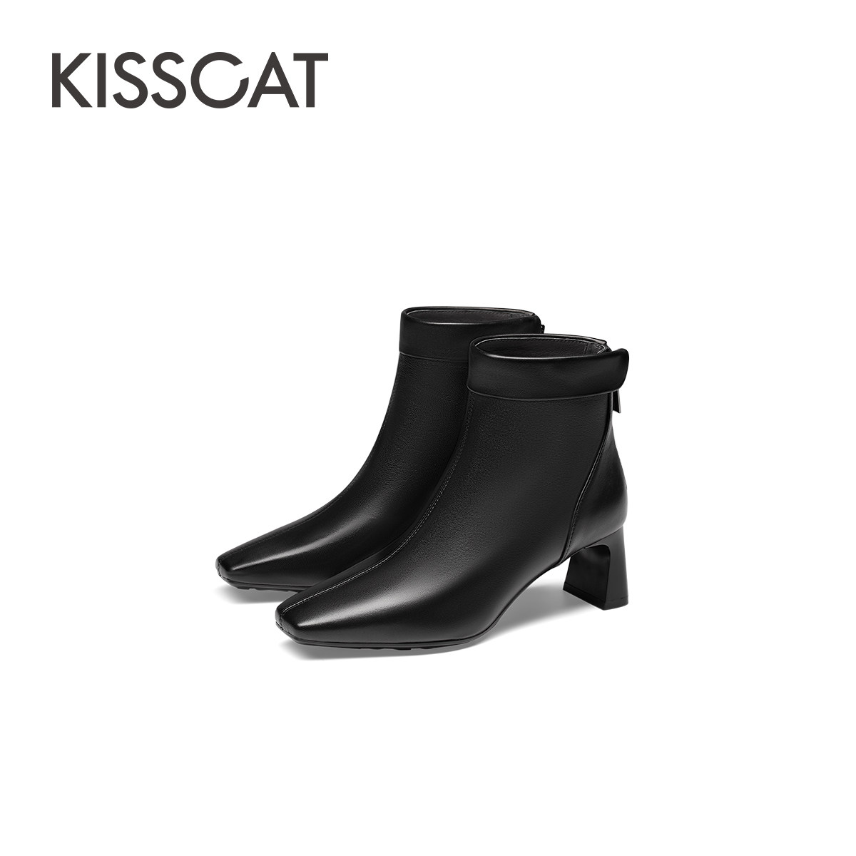 KISSCAT接吻猫春季时尚高跟靴短靴真皮黑色时装靴粗跟方头靴子女