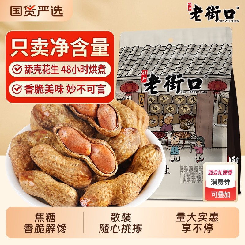 老街口焦糖味花生500g带壳水煮休闲舔壳零食坚果炒货小吃解馋袋装