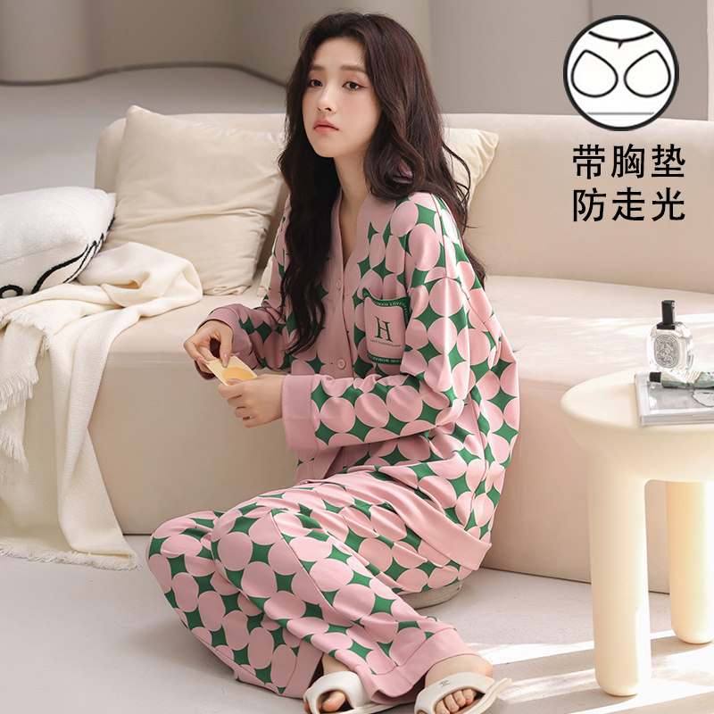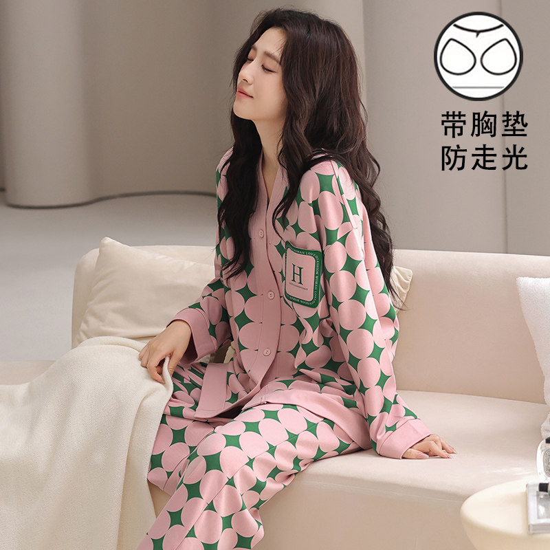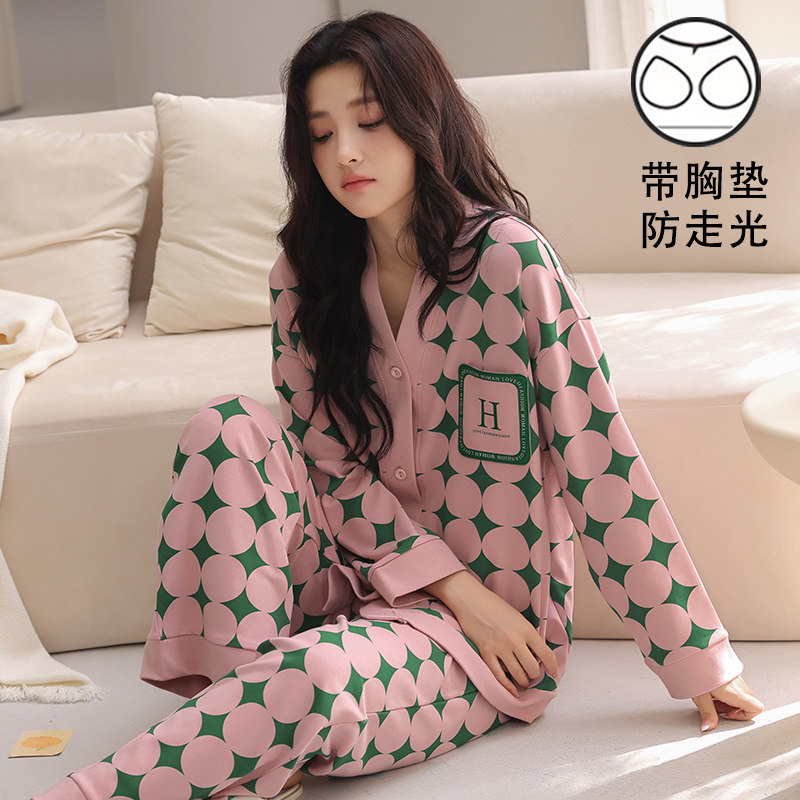 纯棉长袖睡衣女秋季带胸垫可爱卡通款圆领套头春秋天家居服可外穿