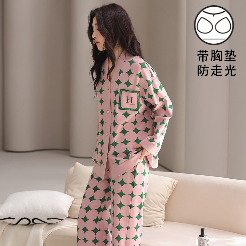 新中式国风竹叶睡衣女春秋款带胸垫长袖长裤甜美少女家居服套装dg