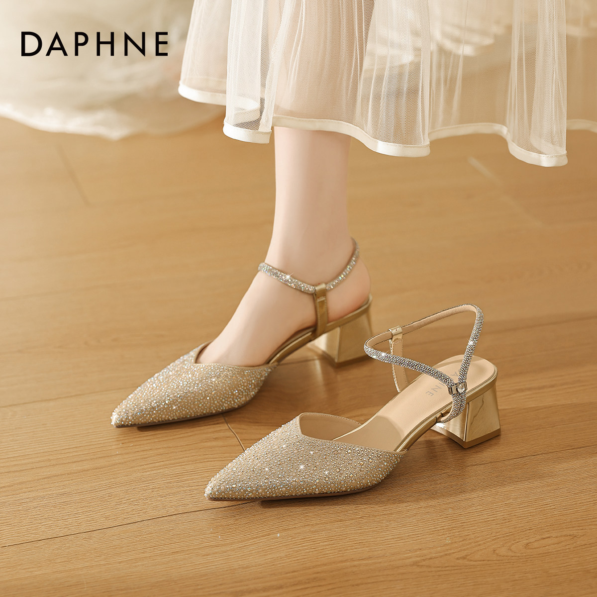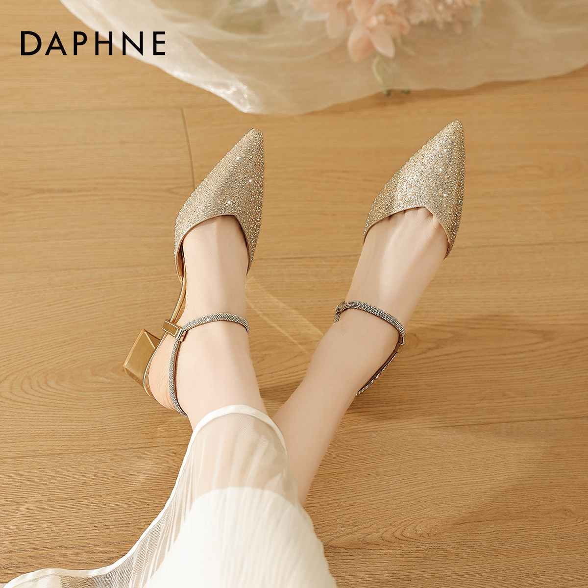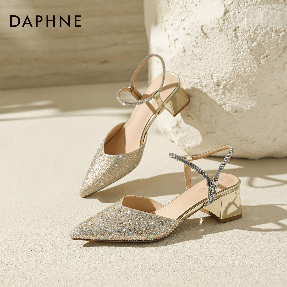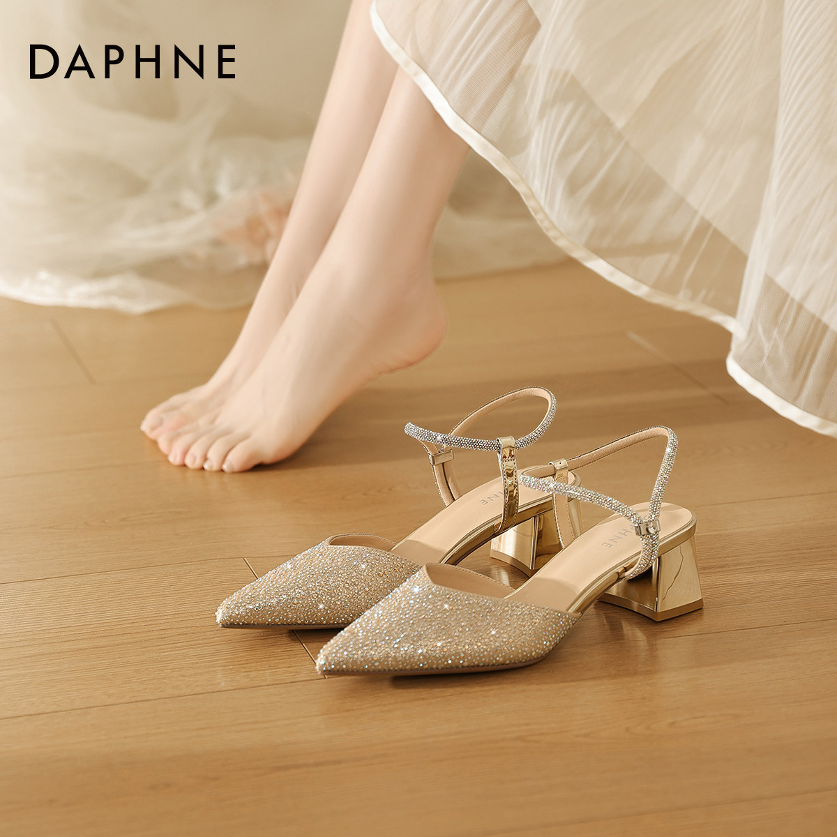 达芙妮尖头粗跟时装凉鞋女款2026新款夏季法式水钻后空高跟鞋婚鞋