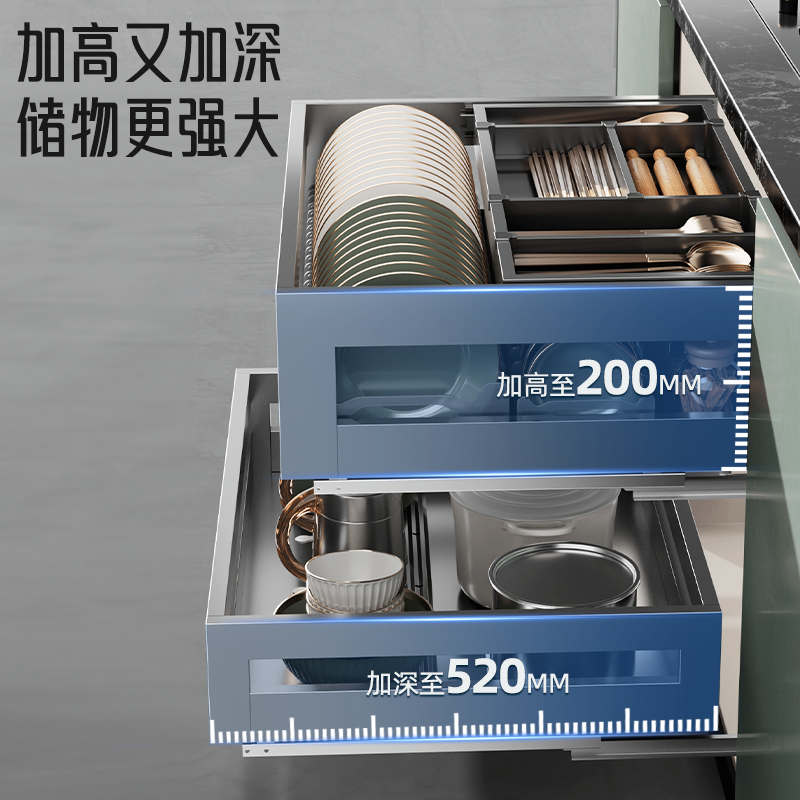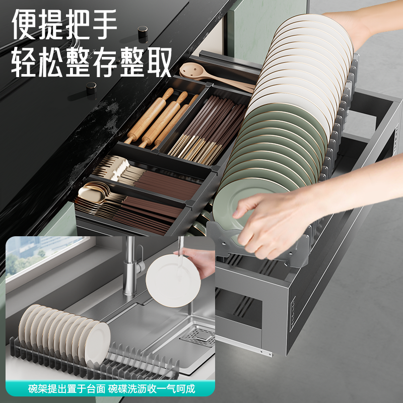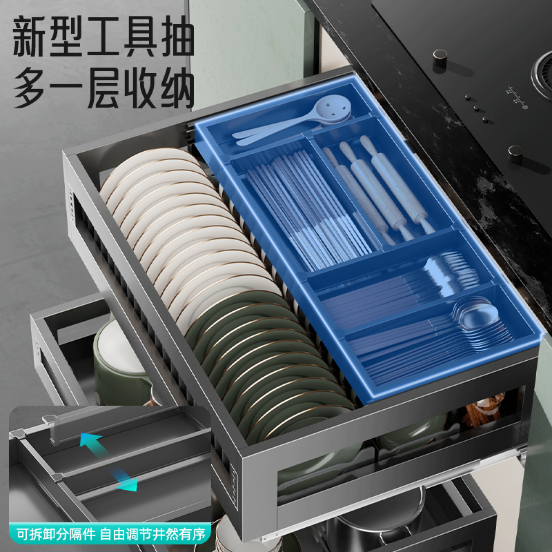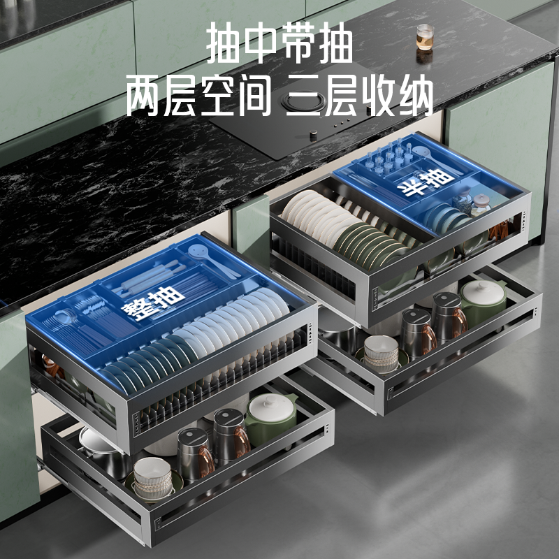 百悍拉篮厨房橱柜双层抽屉式碗篮304不锈钢调味调料篮内置碗碟篮