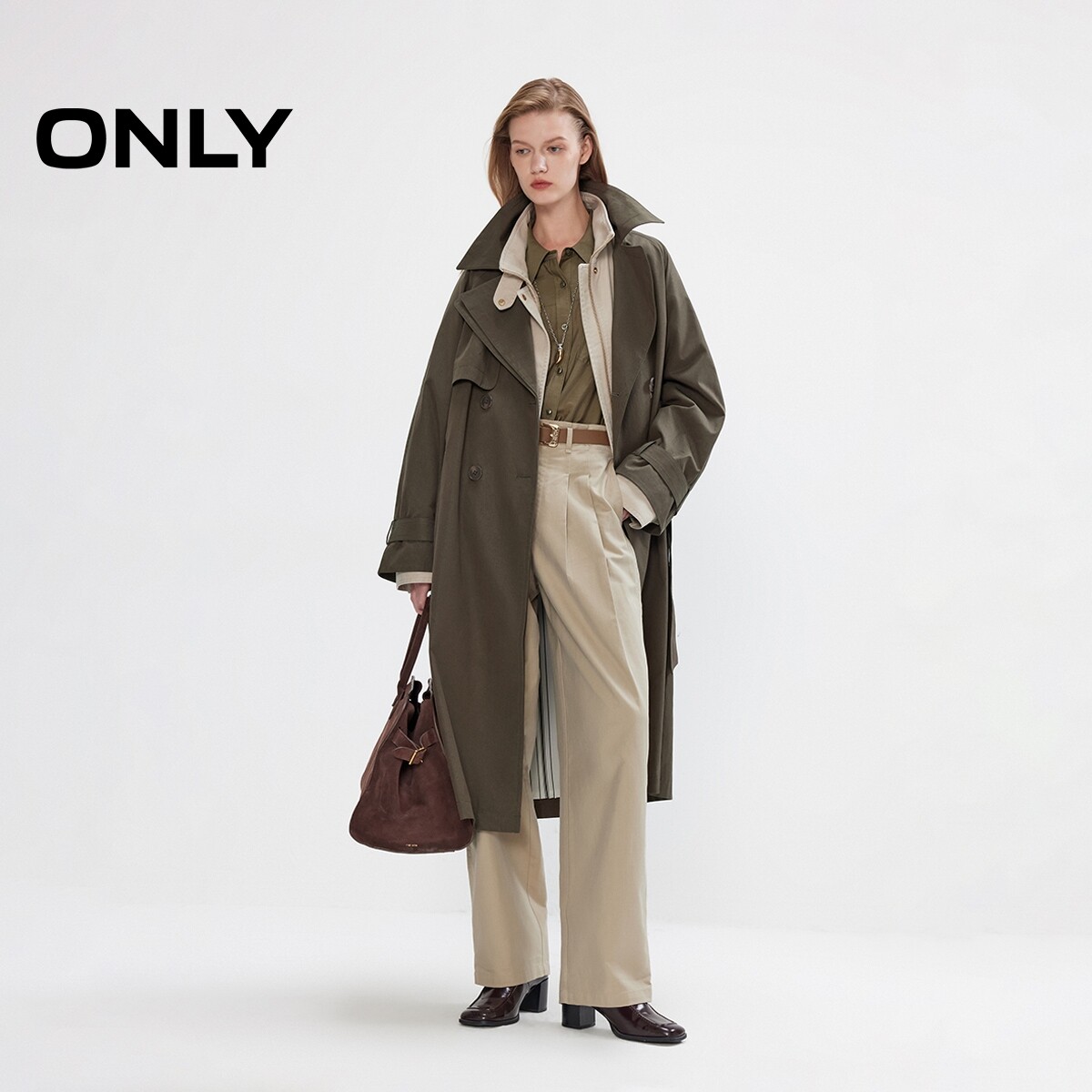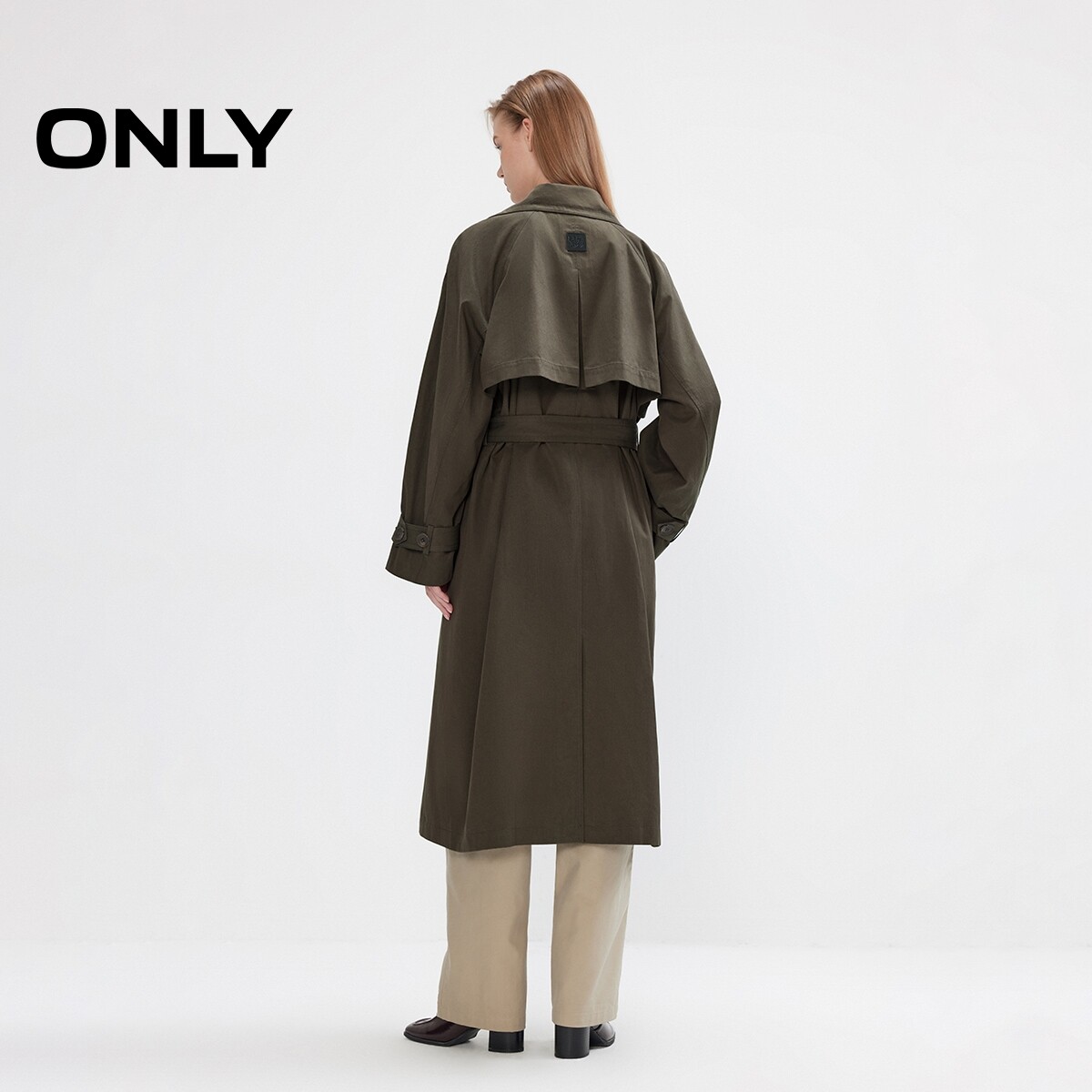 ONLY2026春季新款双排扣不对称双层领松弛插肩廓形长袖风衣外套女