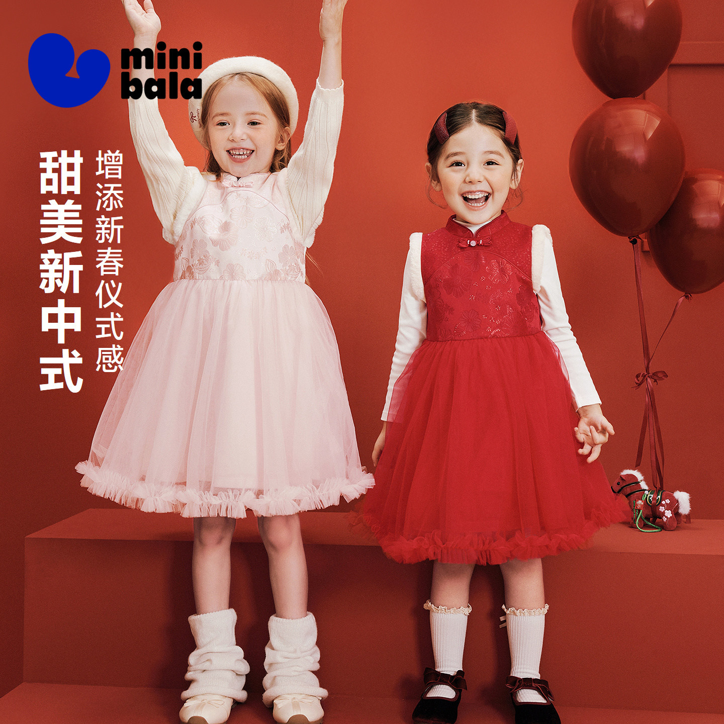 迷你巴拉女童裙子儿童新中式立领拼接网纱连衣裙拜年服2026春新年