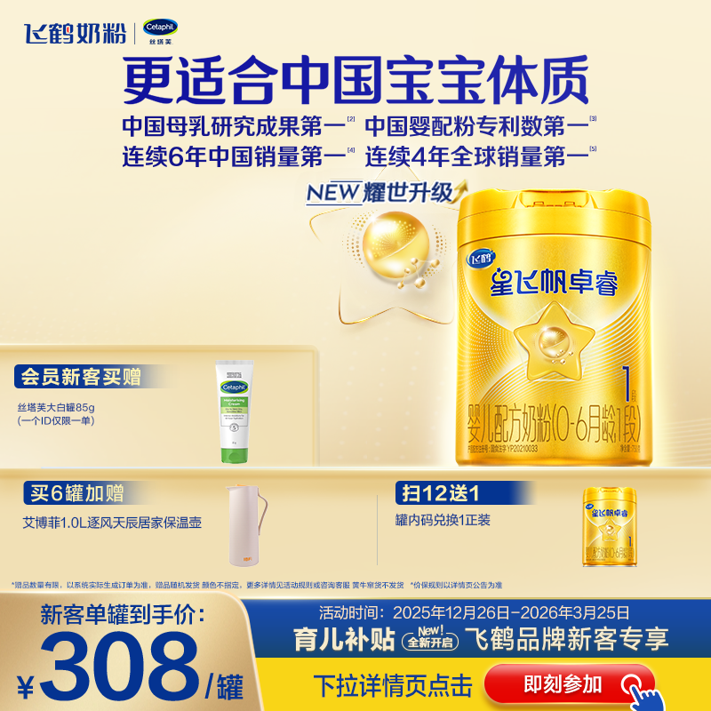 【育儿补贴】飞鹤星飞帆1段0-6个月婴幼儿配方奶粉700g*1罐HMO