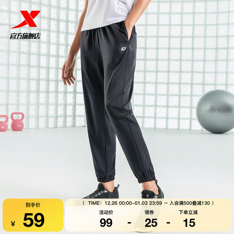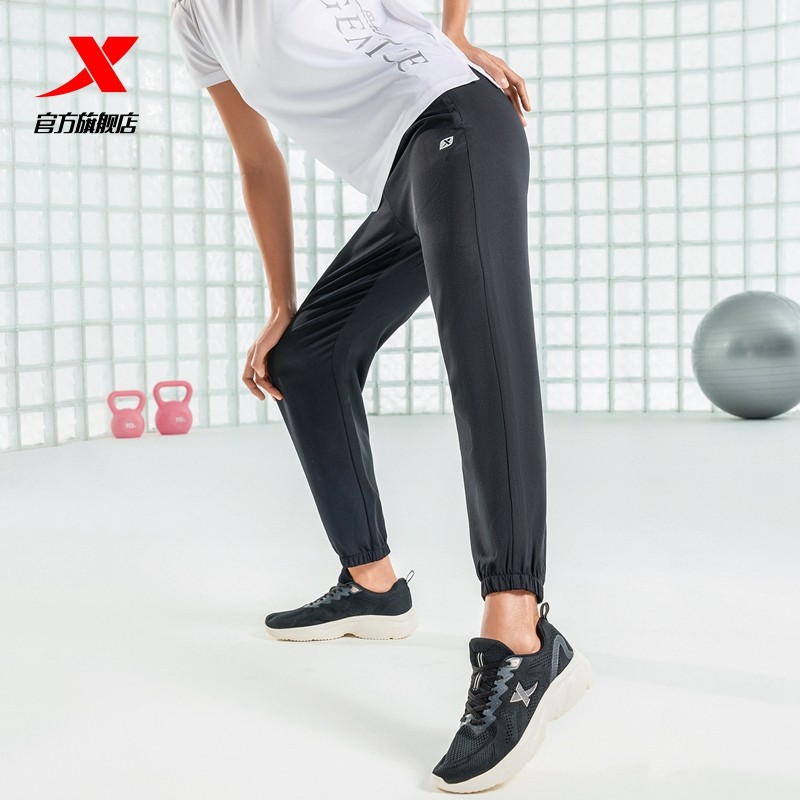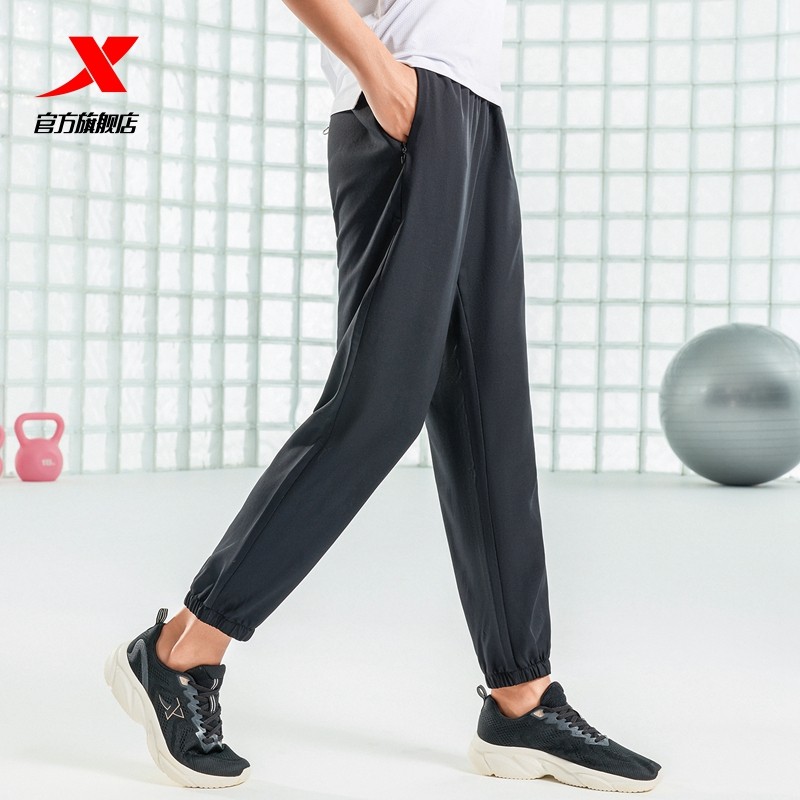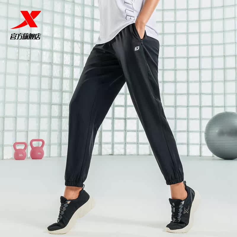 特步运动裤女夏季官方正品训练女裤健身女装透气黑色束脚梭织长裤