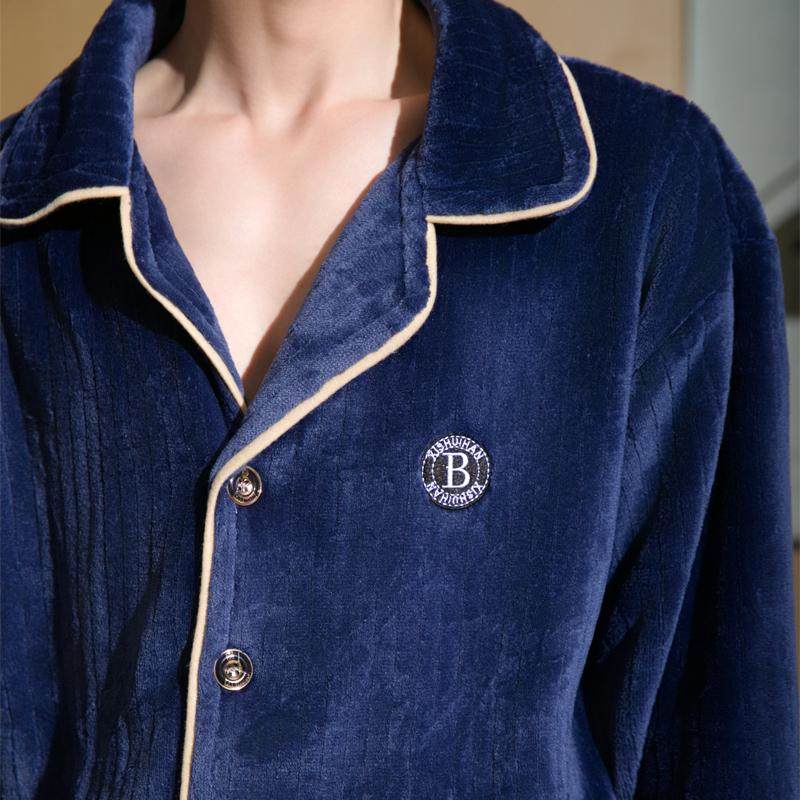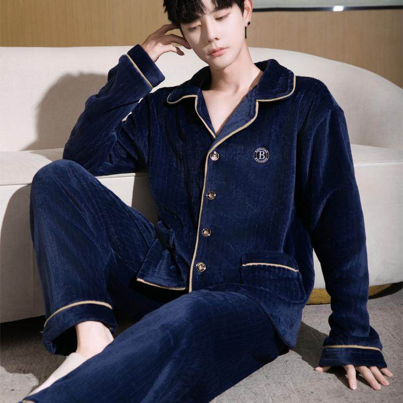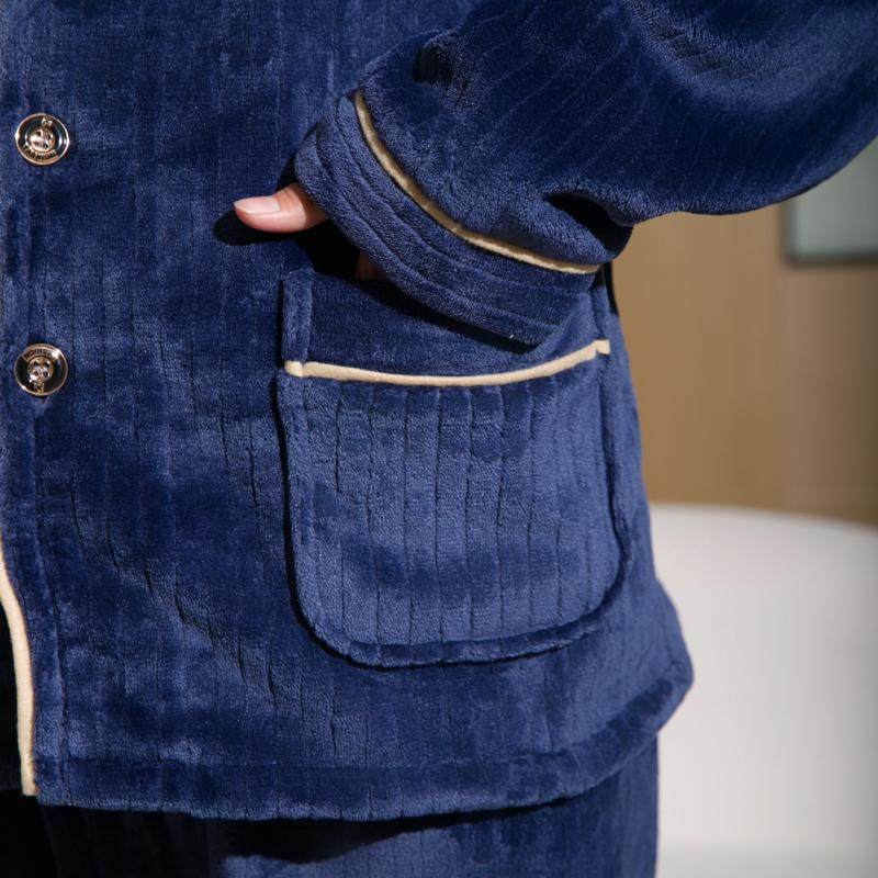 秋冬季法兰绒睡衣男开衫加厚保暖奢华简约大码可外穿珊瑚绒家居服